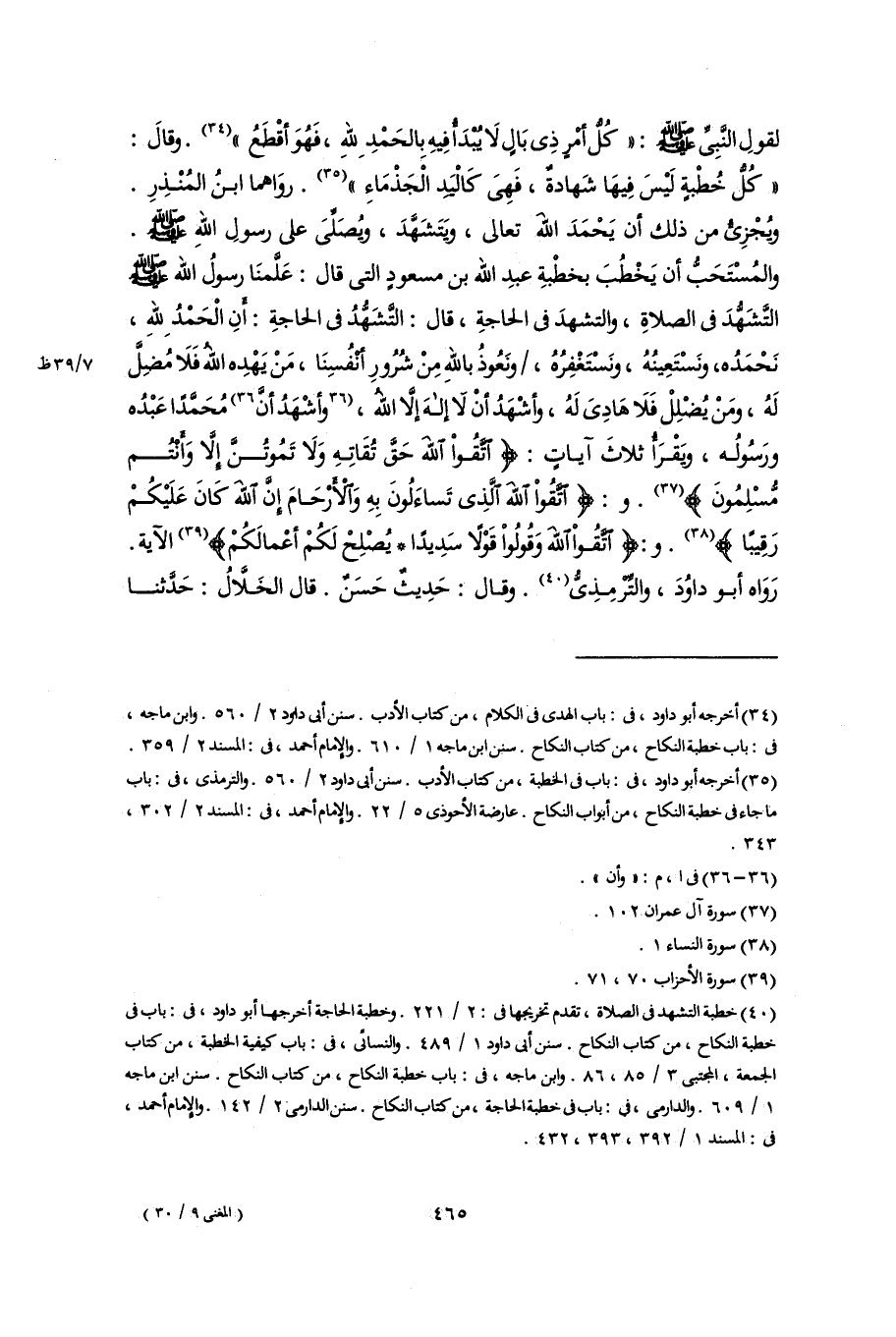 (٣٥) أخرجه أبو داود، فى: باب فى الخطبة، من كتاب الأدب. سنن أبى داود ٢/ ٥٦٠. والترمذى، فى: باب ما جاء فى خطبة النكاح، من أبواب النكاح. عارضة الأحوذى ٥/ ٢٢. والإِمام أحمد، فى: المسند ٢/ ٣٠٢، ٣٤٣.