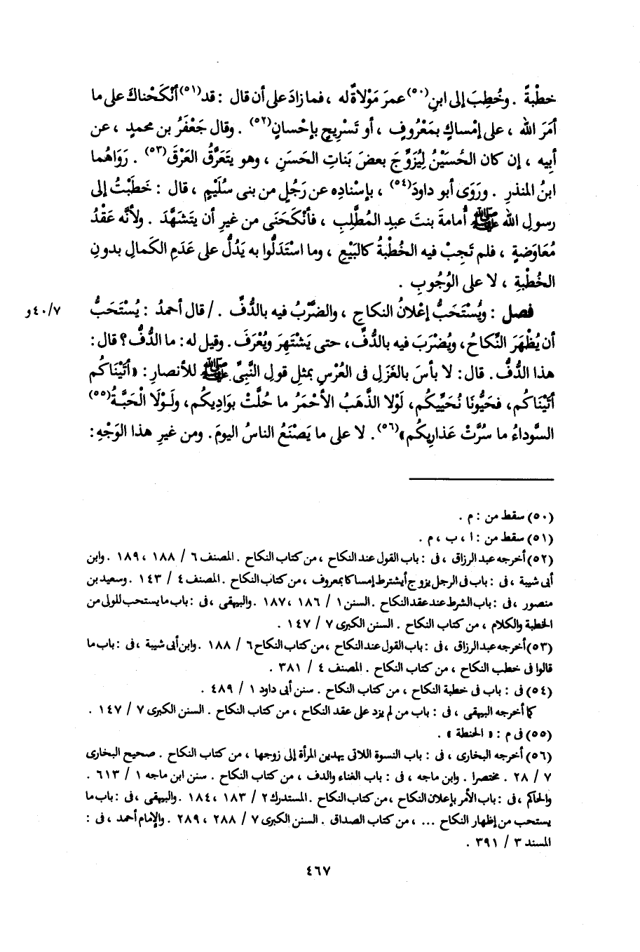 خطْبَةً. وخُطِبَ إلى ابنِ (٥٠) عمرَ مَوْلاةٌ له، فما زادَ على أن قال: قد (٥١) أنْكَحْناكَ على ما أمَرَ اللَّه، على إمْساكٍ بمَعْرُوفٍ، أو تَسْرِيحٍ بإحْسانٍ (٥٢). وقال جَعْفرُ بن محمدٍ، عن أبِيه، إن كان الحُسَيْنُ لِيُزَوِّجَ بعضَ بَناتِ الحَسَنِ، وهو يتَعَرَّقُ العَرْقَ (٥٣). رَوَاهُما ابنُ المنذرِ. ورَوَى أبو داودَ (٥٤)، بإسْنادِه عن رَجُلٍ من بنى سُلَيْمٍ، قال: خَطَبْتُ إلى رسولِ اللَّه -صلى اللَّه عليه وسلم- أُمامةَ بنتَ عبدِ المُطَّلِبِ، فأنْكَحَنَى من غيرِ أن يتَشَهَّدَ. ولأنَّه عَقْدُ مُعَاوَضةٍ، فلم تَجِبْ فيه الخُطْبةُ كالبَيْعِ، وما اسْتَدَلُّوا به يَدُلُّ على عَدَم الكَمالِ بدونِ الخُطْبةِ، لا على الوُجُوبِ.