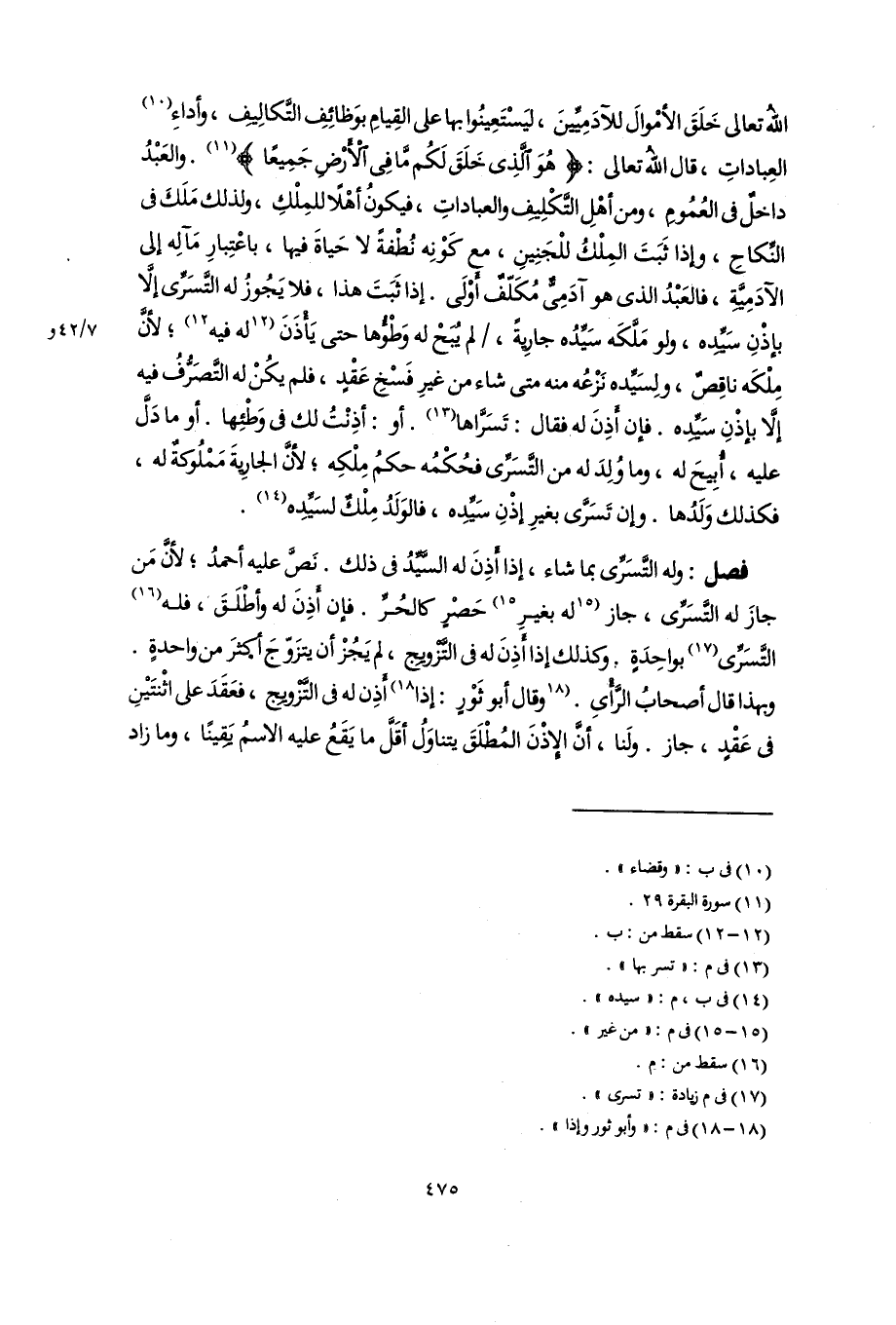 اللَّهُ تعالى خَلَقَ الأمْوالَ للآدَمِيِّينَ، ليَسْتَعِينُوا بها على القِيامِ بوَظائِفِ التَّكالِيفِ، وأداءِ (١٠) العِباداتِ، قال اللَّهُ تعالى: {هُوَ الَّذِي خَلَقَ لَكُمْ مَا فِى الْأَرْضِ جَمِيعًا} (١١). والعَبْدُ داخلٌ فى العُمُومِ، ومن أهْلِ التَّكْلِيفِ والعباداتِ، فيكونُ أهْلًا للمِلْكِ، ولذلك مَلَكَ فى النِّكاحِ، واذا ثَبَتَ المِلْكُ للْجَنِينِ، مع كَوْنِه نُطْفةً لا حَياةَ فيها، باعْتِبارِ مَآلِه إلى الآدَمِيَّةِ، فالعَبْدُ الذى هو آدَمِىٌّ مُكَلّفٌ أَوْلَى. إذا ثَبَتَ هذا، فلا يَجُوزُ له التَّسَرِّى إلَّا بإذْنِ سَيِّده، ولو مَلَّكَه سَيِّدُه جارِيةً، لم يُبَحْ له وَطْؤُها حتى يَأْذَنَ [له فيه] (١٢)؛ لأنَّ مِلْكَه ناقِصٌ، ولِسَيِّده نَزْعُه منه متى شاء من غيرِ فَسْخِ عَقْدٍ، فلم يكُنْ له التَّصَرُّفُ فيه إلَّا بإذْنِ سَيِّده. فإن أَذِنَ له فقال: تَسَرَّاها (١٣). أو: أذِنْتُ لك فى وَطْئِها. أو ما دَلَّ عليه، أُبِيحَ له، وما وُلِدَ له من التَّسَرِّى فحُكْمُه حكمُ مِلْكِه؛ لأنَّ الجارِيةَ مَمْلُوكةٌ له، فكذلك وَلَدُها. وإن تَسَرَّى بغيرِ إذْنِ سَيِّدِه، فالوَلَدُ مِلْكٌ لسَيِّدِه (١٤).