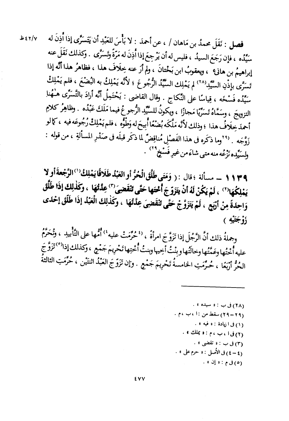 فصل: نَقَلَ محمدُ بن مَاهان، عن أحمدَ: لا بَأْسَ للعَبْدِ أنْ يَتَسَرَّى إذا أَذِنَ له سَيِّدُه، فإن رَجَعَ السَّيِّدُ، فليس له أن يَرْجِعَ إذا أَذِنَ له مَرّةً وتَسَرَّى. وكذلك نَقَلَ عنه إبراهيمُ بن هانىء، ويعقوبُ ابن بَخْتانَ، ولم أرَ عنه خِلَافَ هذا، فظاهرُ هذا أنَّه إذا تَسَرَّى بإذْنِ السَّيِّدِ (٢٨) لم يَمْلِك السَّيِّدُ الرُّجُوعَ؛ لأنَّه يَمْلِكُ به البُضْعَ، فلم يَمْلِكْ سَيِّدُه فَسْخَه، قِياسًا على النِّكاحِ. وقال القاضى: يَحْتَمِلُ أنَّه أرادَ بالتَّسَرِّى ههُنا. التزويجَ، وسَمَّاهُ تَسَرِّيًا مَجازًا، ويكونُ للسَّيِّد الرُّجوعُ فيما مَلَكَ عَبْدُه. وظاهِرُ كلامِ أحمدَ خِلَافُ هذا؛ وذلك لأنَّه مَلَّكَه بُضْعًا أُبِيحَ له وَطْؤُه، فلم يَمْلِكْ رُجُوعَه فيه، كما لو زَوَّجَه. [وما ذكَره فى هذا الفَصْلِ مُناقِضٌ لما ذكَر قبلَه فى صَدْرِ المسألةِ، من قوله: ولسَيِّده نَزْعُه منه متى شاءَ من غيرِ فَسْخٍ] (٢٩).