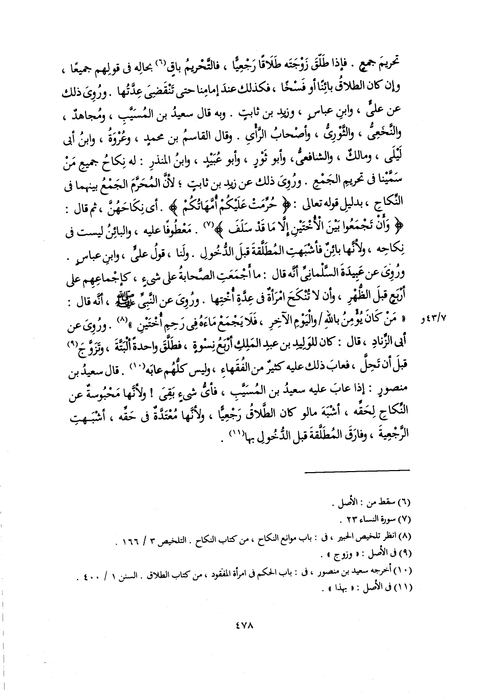 تحريمَ جمعٍ. فإذا طَلّقَ زَوْجَتَه طَلَاقًا رَجْعِيًّا، فالتَّحْريمُ باقٍ (٦) بحالِه فى قولِهم جميعًا، وإن كان الطَّلاقُ بائِنًا أو فَسْخًا، فكذلك عندَ إمامِنا حتى تَنْقَضِىَ عِدَّتُها. ورُوِىَ ذلك عن علىٍّ، وابنِ عباسٍ، وزيدِ بن ثابتٍ. وبه قال سعيدُ بن المُسَيَّبِ، ومُجاهدٌ، والنَّخَعِىُّ، والثَّوْرِىُّ، وأصْحابُ الرَّأْىِ. وقال القاسمُ بن محمدٍ، وعُرْوَةُ، وابنُ أبى لَيْلَى، ومالكٌ، والشافعىُّ، وأبو ثَوْرٍ، وأبو عُبَيْدٍ، وابنُ المنذرِ: له نِكاحُ جميعِ مَنْ سَمَّيْنا فى تحريِم الجَمْعِ. ورُوِىَ ذلك عن زيدِ بن ثابتٍ؛ لأنَّ المُحَرَّمَ الجَمْعُ بينهما فى النِّكاحِ، بدليلِ قوله تعالى: {حُرِّمَتْ عَلَيْكُمْ أُمَّهَاتُكُمْ}. أى نِكَاحَهُنَّ، ثم قال: {وَأَنْ تَجْمَعُوا بَيْنَ الْأُخْتَيْنِ إِلَّا مَا قَدْ سَلَفَ} (٧). مَعْطُوفًا عليه، والبائِنُ ليست فى نِكاحِه، ولأنَّها بائِنٌ فأشْبَهتِ المُطَلَّقةَ قبلَ الدُّخُولِ. ولَنا، قولُ علىٍّ، وابنِ عباسٍ. ورُوِى عن عَبِيدَةَ السَّلْمانِىِّ أنَّه قال: ما أَجْمَعَتِ الصَّحابةُ على شىءٍ، كإجْماعِهِم على أرْبَعٍ قبلَ الظُّهْرِ، وأن لا تُنْكَحَ امْرَأةٌ فى عِدَّةِ أُخْتِها. ورُوِىَ عن النَّبِىِّ -صلى اللَّه عليه وسلم-، أنَّه قال: "مَنْ كَانَ يُؤْمِنُ باللَّهِ والْيَوْمِ الآخِرِ، فَلَا يَجْمَعْ مَاءَهُ فى رَحِمِ أُخْتَيْنِ" (٨). ورُوِىَ عن أبى الزِّنادِ، قال: كان للوَلِيدِ بن عبدِ المَلِكِ أرْبَعُ نِسْوةٍ، فطَلَّقَ واحدةً ألْبَتَّةَ، وتَزَوَّجَ (٩) قبلَ أن تَحِلَّ، فعابَ ذلك عليه كثيرٌ من الفُقَهاءِ، وليس كلُّهُم عابَه (١٠). قال سعيدُ بن منصورٍ: إذا عابَ عليه سعيدُ بن المُسَيَّبِ، فأىُّ شىءٍ بَقِىَ! ولأنَّها مَحْبُوسةٌ عن النِّكاحِ لِحَقِّه، أشْبَهَ ما لو كان الطَّلاقُ رَجْعِيًّا، ولأنَّها مُعْتَدَّةٌ فى حَقِّه، أشْبَهتِ الرَّجْعِيةَ، وفارَقَ المُطَلَّقةَ قبل الدُّخُولِ بها (١١).