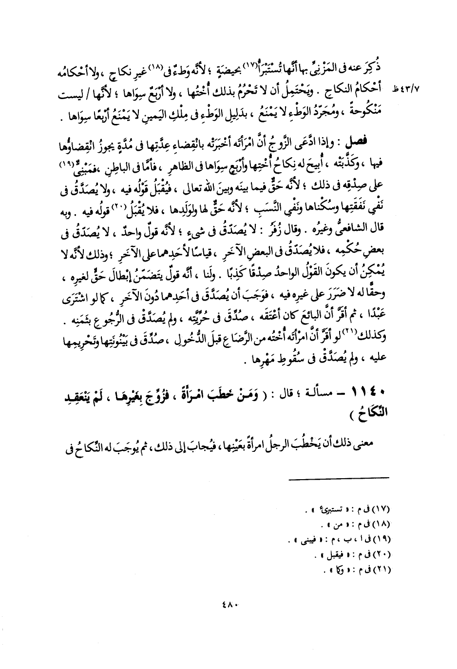 ذُكِرَ عنه فى المَزْنِىِّ بها أنَّها تُسْتَبْرَأُ (١٧) بحيضَةٍ؛ لأنَّه وَطءٌ فى (١٨) غيرِ نكاحٍ، ولا أحْكامُه أحْكامُ النكاحِ. ويَحْتَمِلُ أن لا تَحْرُمُ بذلك أُخْتُها، ولا أرْبَعٌ سِوَاها؛ لأنَّها ليست مَنْكُوحةً، ومُجَرّدُ الوَطْءِ لا يَمْنَعُ، بدَلِيلِ الوَطْءِ فى مِلْكِ اليَمينِ لا يَمْنَعُ أرْبعًا سِوَاها.