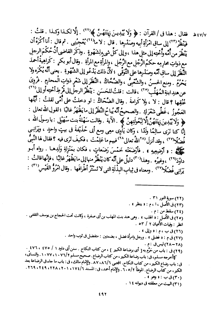 فقال: هذا فى القرآن: {وَلَا يُبْدِينَ زِينَتَهُنَّ} (٢٢). إلَّا لكذا وكذا. قلتُ: فيَنْظُرُ (٢٣) إلى ساقِ امْرَأةِ أبِيه وصَدْرِها. قال: لا ما (٢٤) يُعْجِبُنِى. ثم قال: أنا أكْرَهُ أن يَنْظُرَ من أُمِّه وأُخْتِه إلى مثلِ هذا، وإلى كلِّ شىءٍ لِشَهْوةٍ. وذكَرَ القاضى أَنَّ حُكْمَ الرجلِ مع ذواتِ محارِمِه حكمُ الرَّجُلِ مع الرَّجُلِ، والمرأةِ مع المرأةِ. وقال أبو بكرٍ: كَراهِيةُ أحمدَ النَّظَرَ إلى ساقِ أمِّه وصَدْرِها على التَّوَقِّى؛ لأنَّ ذلك يَدْعُو إلى الشَّهْوةِ. يعنى أنَّه يُكْرَه ولا يَحْرُمُ. ومنع الحسنُ، والشَّعْبِىُّ، والضَّحَّاكُ، النَّظَرَ إلى شَعْرِ ذواتِ الْمحارِم. فرُوِىَ عن هندِ ابنةِ المُهَلَّبِ (٢٥)، قالت: قلتُ للحَسَنِ: يَنْظُرُ الرجلُ إلى قُرْطِ أخْتِه أو إلى (٢٦) عُنُقِها؟ قال: لا، ولا كَرامةَ. وقال الضَّحّاكُ: لو دخلتُ على أُمِّى لقلتُ: أيَّتُها العَجُوزُ، غَطِّى شَعْرَكِ. والصحيحُ أنَّه يُباحُ النَّظَرُ إلى ما يَظْهَرُ غالبًا؛ لقولِ اللَّه تعالى: {وَلَا يُبْدِينَ زِينَتَهُنَّ إِلَّا لِبُعُولَتِهِنَّ}. الآية. وقالت سَهْلةُ بنت سُهَيْلٍ: يا رسولَ اللَّه، إنَّا كنا نَرَى سالِمًا ولَدًا، وكان يَأْوِى معِى ومع أبى حُذَيْفةَ فى بيتٍ واحدٍ، ويَرَانِى فُضُلًا (٢٧)، وقد أنزلَ [اللَّهُ تعالى] (٢٨) فيهم ما عَلِمْتَ، فكيفَ تَرَى فيه؟ فقال لها النَّبِىُّ -صلى اللَّه عليه وسلم-: "أرْضِعِيهِ". فأرْضَعَتْه خَمْسَ رَضَعاتٍ، فكان بمَنْزِلةِ وَلَدِها. رواه أبو داوُدَ (٢٩)، وغيرُه. وهذا (٣٠) دليلٌ على أنَّه كان يَنْظُرُ منها إلى ما يَظْهَرُ غالِبًا، فإنَّها قالتْ: يَرَانِى فُضُلًا (٢٧). ومعناه فى ثِيابِ البِذْلَةِ التى لا تَسْتُرُ أطْرافَها. وقال امْرُؤُ القَيْسِ (٣١):