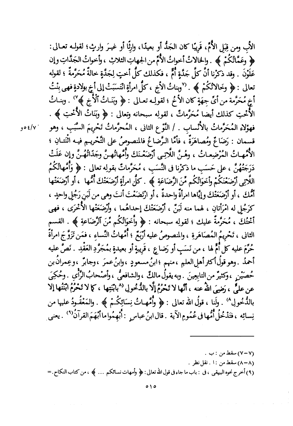الأبِ ومن قِبَلِ الأُمِّ، قَرِيبًا كان الجَدُّ أو بعيدًا، وارِثًا أو غيرَ وارثٍ؛ لقوله تعالى: {وَعَمَّاتُكُمْ}. والخالاتُ أخواتُ الأُمِّ من الجهاتِ الثلاثِ، وأخواتُ الجَدَّاتِ وإن عَلَوْنَ. وقد ذكرْنا أَنَّ كلَّ جَدَّةٍ أُمٌّ، فكذلك كلُّ أختٍ لِجَدَّةٍ خالةٌ مُحَرَّمةٌ؛ لقوله تعالى: {وَخَالَاتُكُمْ}. [وبناتُ الأَخِ، كلُّ امرأةٍ انْتَسَبَتْ إلى أخٍ بولادةٍ فهى بِنْتُ أخٍ مُحَرَّمة من أىِّ جِهَةٍ كان الأخُ؛ لقولِه تعالى: {وَبَنَاتُ الْأَخِ}] (٧). وبناتُ الأُخْتِ كذلك أيضًا مُحَرَّماتٌ، لقولِه سبحانه وتعالى: {وَبَنَاتُ الْأُخْتِ}. فهؤلاء المُحَرَّماتُ بالأَنْسابِ. النَّوْع الثانى، المُحرَّماتُ تَحْرِيمَ السَّبَبِ، وهو قسمان: رَضَاعٌ ومُصاهَرةٌ، فأمَّا الرَّضاعُ فالمنصوصُ على التَّحْريمِ فيه اثْنَتانِ؛ الأُمَّهاتُ المُرْضِعاتُ، وهُن اللَّاتِى أرْضَعْنَكَ وأمَّهاتُهن وجَدّاتُهُنَّ وإن عَلَتْ دَرَجَتُهُنَّ، على حَسَبِ ما ذكرْنا فى النَّسَبِ، مُحَرَّماتٌ بقولِه تعالى: {وَأُمَّهَاتُكُمُ اللَّاتِى أَرْضَعْنَكُمْ وَأَخَوَاتُكُمْ مِنَ الرَّضَاعَةِ}. كلُّ امرأةٍ أرْضَعَتْكَ أُمُّها، أو أرْضَعَتْها أمُّكَ، أو أرْضَعَتْكَ وإيَّاها امرأةٌ واحدةٌ، أو ارْتَضَعْتَ أنتَ وهى من لَبَنِ رَجُلٍ واحدٍ، كرَجُلٍ له امْرَأتانِ، لهما منه لَبَنٌ، أرْضَعَتْكَ إحداهُما، وأرْضَعَتْها الأُخْرَى، فهى أخْتُكَ، مُحَرَّمةٌ عليك؛ لقولِه سبحانه: {وَأَخَوَاتُكُمْ مِنَ الرَّضَاعَةِ}. القسم الثانى، تَحْرِيمُ المُصَاهَرةِ، والمنصوصُ عليه أرْبَعٌ؛ أُمَّهاتُ النِّساءِ، فمَن تَزَوَّجَ امرأةً حُرِّمَ عليه كل أُمٍّ لها، من نَسَبٍ أو رَضاعٍ، قَرِيبةٍ أو بعيدةٍ بمُجَرَّدِ العَقْدِ. نَصَّ عليه أحمدُ. وهو قولُ أكثر أهلِ العلمِ، منهم؛ ابنُ مسعودٍ، وابنُ عمرَ، وجابرٌ، وعِمرانُ بن حُصَيْنٍ، وكثيرٌ من التابِعِينَ. وبه يقولُ مالكٌ، والشافعىُّ، وأصْحابُ الرَّأْىِ. وحُكِىَ عن علىٍّ، رَضِىَ اللَّهُ عنه، أنَّها لا تَحْرُمُ إلَّا بالدُّخُولِ [بابْنَتِها، كما لا تَحْرُمُ ابْنَتُها إلا بالدُّخُولِ] (٨). ولَنا، قولُ اللَّه تعالى: {وَأُمَّهَاتُ نِسَائِكُمْ}. والمَعْقُودُ عليها من نِسائِه، فتَدْخُلُ أمُّها فى عُمُومِ الآية، قال ابنُ عباسٍ: أَبْهِمُوا ما أبْهَمَ القرآنُ (٩). يعنى