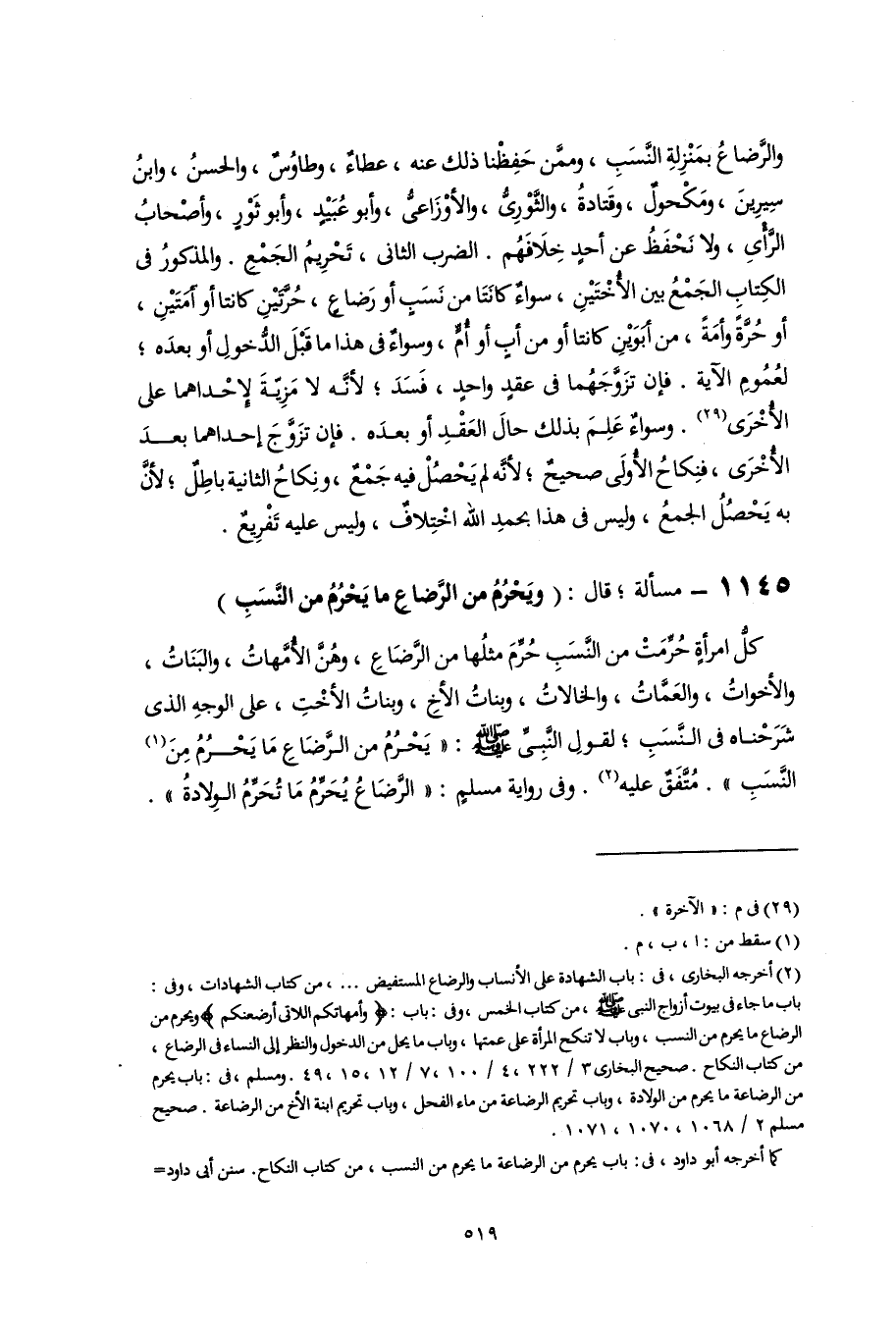 والرَّضاعُ بمَنْزِلةِ النَّسَبِ، وممَّن حَفِظْنا ذلك عنه، عطاءٌ، وطاوُسٌ، والحسنُ، وابنُ سِيرِينَ، ومَكْحول، وقَتادةُ، والثَّوْرِىُّ، والأوْزَاعىُّ، وأبو عُبَيْدٍ، وأبو ثَوْرٍ، وأصْحابُ الرَّأْىِ، ولا نَحْفَظُ عن أحدٍ خِلَافَهُم. الضرب الثانى، تَحْرِيمُ الجَمْعِ. والمذكورُ فى الكِتابِ الجَمْعُ بين الأُخْتَيْنِ، سواء كانَتَا من نَسَبٍ أو رَضاعٍ، حُرَّتَيْنِ كانتا أو أمَتَيْنِ، أو حُرَّة وأمَةً، من أبَوَيْنِ كانتا أو من أبٍ أو أُمٍّ، وسواءٌ فى هذا ما قَبْلَ الدُّخولِ أو بعدَه؛ لعُمُومِ الآية. فإن تزَوَّجَهُما فى عقدٍ واحدٍ، فَسَدَ؛ لأنَّه لا مَزِيّةَ لإحْداهما على الأُخْرَى (٢٩). وسواءٌ عَلِمَ بذلك حالَ العَقْدِ أو بعدَه. فإن تزَوَّجَ إحداهما بعدَ الأُخْرَى، فنِكاحُ الأولَى صحيحٌ؛ لأنَّه لم يَحْصُلْ فيه جَمْعٌ، ونِكاحُ الثانية باطِلٌ؛ لأنَّ به يَحْصُلُ الجمعُ، وليس فى هذا بحمدِ اللَّه اخْتِلافٌ، وليس عليه تَفْرِيعٌ.