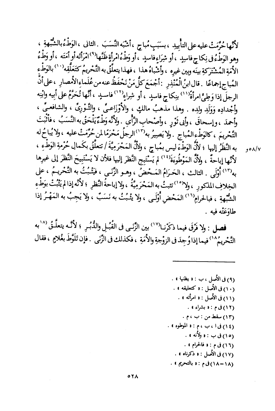 لأنَّها حُرِّمَتْ عليه على التأْبِيدِ، بسَبَبٍ مُباحٍ، أشْبَه النَّسَبَ. الثانى، الوَطْءُ بالشُّبْهةِ، وهو الوَطْءُ فى نِكاح فاسِدٍ، أو شِرَاءٍ فاسدٍ، أو وَطْءُ امْرأةٍ ظَنَّها (٩) امْرَأتَه أو أمَتَه، أو وَطْءُ الأَمَةِ المُشْتَرَكةِ بينَه وبين غيرِه، وأشْباهُ هذا، فهذا يتعلَّقُ به التَّحْريمُ كتَعَلُّقِه (١٠) بالوَطْءِ المُباحِ إجماعًا. قال ابنُ الْمُنْذِرِ: أجْمَعَ كلُّ مَنْ نَحْفَظُ عنه من عُلَماءِ الأمصارِ، على أنَّ الرجلَ إذا وَطِى امرأةً (١١) بنِكاحٍ فاسدٍ، أو شِراءٍ (١٢) فاسدٍ، أنَّها تُحَرَّمُ على أبِيه وابْنِه وأجْدادِه وَوَلَدِ ولدِه. وهذا مذهبُ مالكٍ، والأوْزَاعىِّ، والثَّوْرِىِّ، والشافعىِّ، وأحمدَ، وإسحاقَ، وأبى ثَوْرٍ، وأصْحاب الرَّأْىِ. ولأنَّه وَطْء يَلْحَقُ به النَّسَبُ، فأثْبَتَ التَّحْريمَ، كالوَطْء المُباحِ. ولا يَصِيرُ به (١٣) الرجلُ مَحْرَمًا لمن حُرِّمَتْ عليه، ولا يُباحُ له به النَّظَرُ إليها؛ لأنَّ الوَطْءَ ليس بمُباح، ولأنَّ المَحْرَمِيَّةَ تتعلَّقُ بكَمالِ حُرْمةِ الوَطْءِ، لأنَّها إباحةٌ، ولأنَّ المَوْطُوءَةَ (١٤) لم يَسْتَبِحِ النَّظرَ إليها فلأن لا يَسْتَبِيحَ النَّظرَ إلى غيرِها به (١٣) أَوْلَى. الثالث، الحَرَامُ المَحْضُ، وهو الزِّنى، فيَثْبُتُ به التَّحْريمُ، على الخِلافِ المذكورِ، ولا (١٥) تثبتُ به المَحْرَمِيَّةُ، ولا إباحةُ النَّظرِ؛ لأنَّه إذا لم يَثْبُتْ بوَطْءِ الشُّبْهةِ، فبالحرامِ (١٦) المَحْض أَوْلَى، ولا يثْبُتُ به نَسَبٌ، ولا يَجِبُ به المَهْرُ إذا طاوَعَتْه فيه.