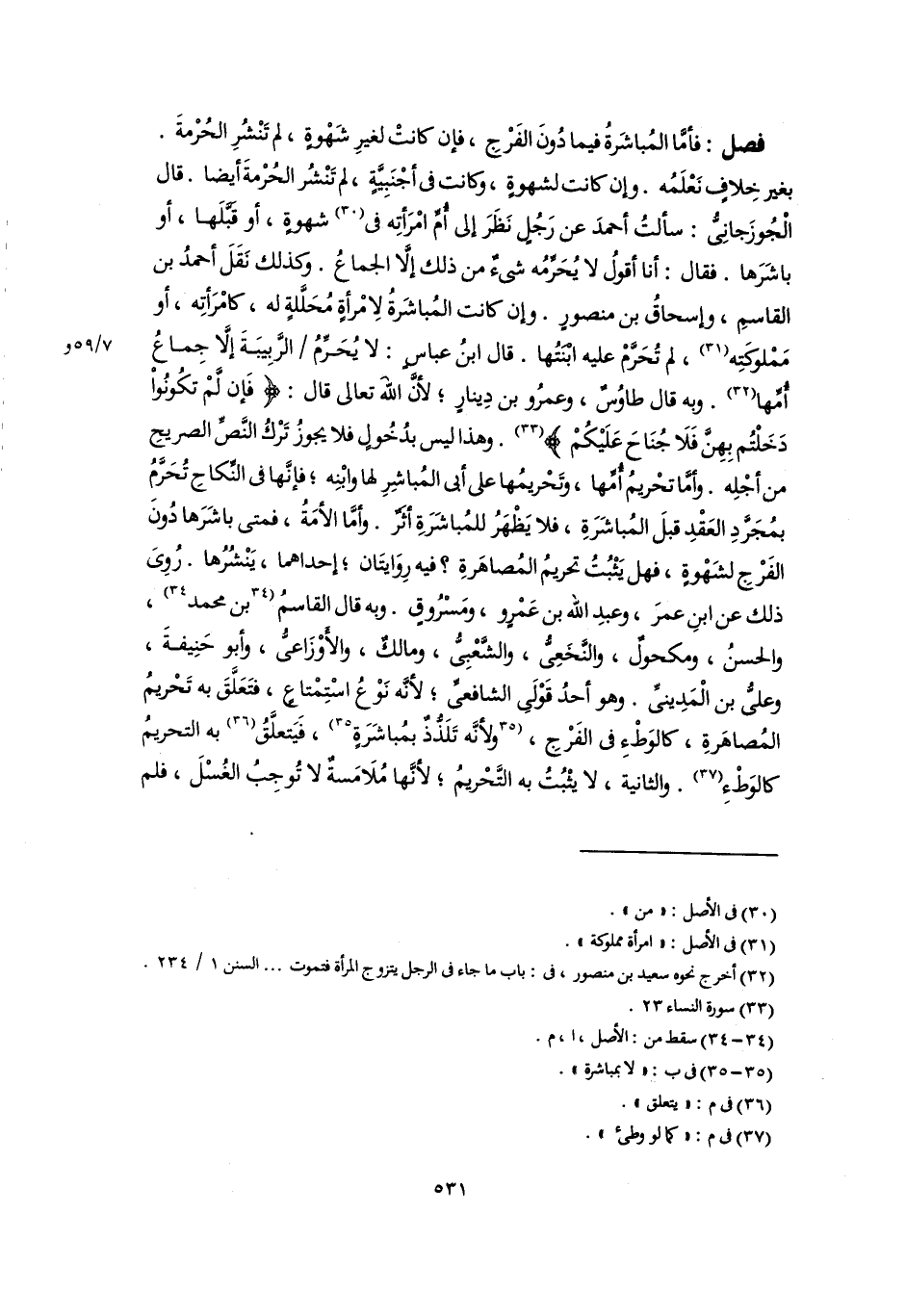 فصل: فأمَّا المُباشَرةُ فيما دُونَ الفَرْجِ، فإن كانتْ لغيرِ شَهْوةٍ، لم تَنْشُرِ الحُرْمةَ. بغير خِلافٍ نَعْلَمُه. وإن كانت لشهوةٍ، وكانت فى أجْنَبِيَّةٍ، لم تَنْشُر الحُرْمةَ أيضًا. قال الْجُوزَجانِىُّ: سألتُ أحمدَ عن رَجُل نَظَرَ إلى أُمِّ امْرَأتِه فى (٣٠) شهوةٍ، أو قَبَّلَها، أو باشَرَها. فقال: أنا أقولُ لا يُحَرِّمُه شىءٌ من ذلك إلَّا الجماعُ. وكذلك نَقَلَ أحمدُ بن القاسمِ، وإسحاقُ بن منصورٍ. وإن كانت المُباشَرةُ لِامْرأةٍ مُحَلَّلةٍ له، كامْرَأتِه، أو مَمْلوكَتِه (٣١)، لم تُحَرَّمْ عليه ابْنَتُها. قال ابنُ عباسٍ: لا يُحَرِّمُ الرَّبِيبَةَ إلا جِماعُ أُمِّها (٣٢). وبه قال طاوُسٌ، وعمرُو بن دِينارٍ؛ لأنَّ اللَّه تعالى قال: {فَإِنْ لَمْ تَكُونُوا دَخَلْتُمْ بِهِنَّ فَلَا جُنَاحَ عَلَيْكُمْ} (٣٣). وهذا ليس بدُخُولٍ فلا يجوزُ تَرْكُ النَّصِّ الصريحِ من أجْلِه. وأمَّا تحْريمُ أُمِّها، وتَحْريمُها على أبى المُباشِرِ لها وابْنِه؛ فإنَّها فى النِّكاحِ تُحَرَّمُ بمُجَرِّدِ العَقْدِ قبلَ المُباشَرَةِ، فلا يَظْهَرُ للمُباشَرَةِ أثَرٌ. وأمَّا الأمَةُ، فمتى باشَرَها دُونَ الفَرْجِ لشَهْوةٍ، فهل يَثْبُتُ تحريمُ المُصاهَرةِ؟ فيه رِوَايتَان؛ إحداهما، يَنْشُرُها. رُوِىَ ذلك عن ابنِ عمرَ، وعبدِ اللَّه بن عَمْرٍو، ومَسْرُوقٍ. وبه قال القاسمُ [بن محمد] (٣٤)، والحسنُ، ومكحولٌ، والنَّخَعِىُّ، والشَّعْبِىُّ، ومالكٌ، والأَوْزَاعىُّ، وأبو حَنِيفةَ، وعلىُّ بن الْمَدِينىِّ. وهو أحدُ قَوْلَى الشافعىِّ؛ لأنَّه نَوْعُ اسْتِمْتاع، فتَعَلَّقَ به تَحْريمُ المُصاهَرةِ، كالوَطْءِ فى الفَرْجِ، [ولأنَّه تَلَذُّذٌ بمُباشَرَةٍ] (٣٥)، فَيَتعلَّقُ (٣٦) به التحريمُ كالوَطْءِ (٣٧). والثانية، لا يثْبُتُ به التَّحْريمُ؛ لأنَّها مُلَامَسةٌ لا تُوجِبُ الغُسْلَ، فلم