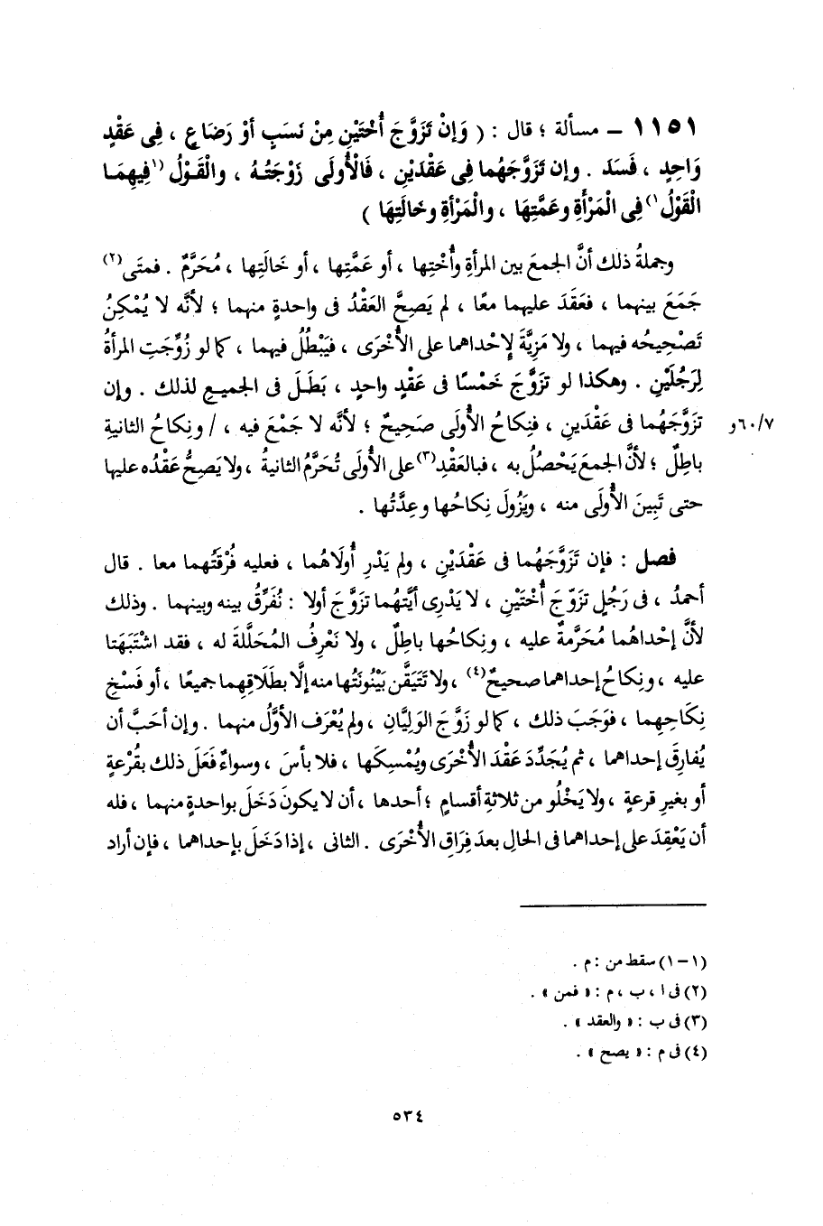 وجملةُ ذلك أَنَّ الجمعَ بين المرأةِ وأُخْتِها، أو عَمَّتِها، أو خَالَتِها، مُحَرَّمٌ. فمتَى (٢) جَمَعَ بينهما، فعَقَدَ عليهما معًا، لم يَصِحَّ العَقْدُ فى واحدةٍ منهما؛ لأنَّه لا يُمْكِنُ تَصْحِيحُه فيهما، ولا مَزِيَّةَ لإحْداهما على الأُخْرَى، فيَبْطُلُ فيهما، كما لو زُوِّجَتِ المرأةُ لِرَجُلَيْنِ. وهكذا لو تزَوَّجَ خَمْسًا فى عَقْدٍ واحدٍ، بَطَلَ فى الجميعِ لذلك. وإن تزَوَّجَهُما فى عَقْدَينِ، فنِكاحُ الأولَى صَحِيحٌ؛ لأنَّه لا جَمْعَ فيه، ونِكاحُ الثانيةِ باطِلٌ؛ لأنَّ الجمعَ يَحْصُلُ به، فبالعَقْدِ (٣) على الأولَى تُحَرَّمُ الثانيةُ، ولا يَصِحُّ عَقْدُه عليها حتى تَبِينَ الأُولَى منه، ويَزُولَ نِكاحُها وعِدَّتُها.