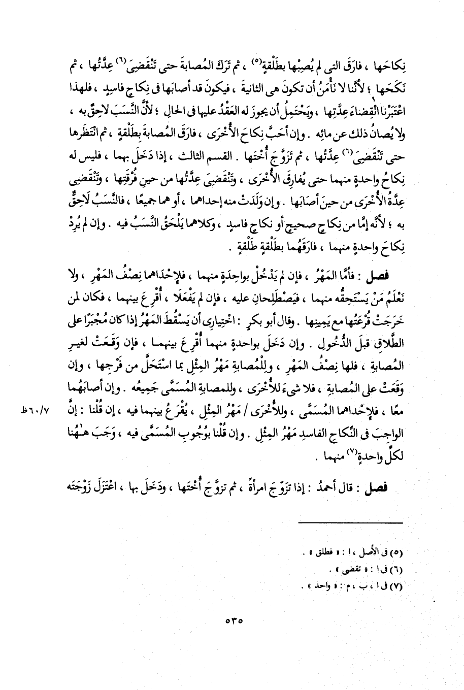 نِكاحَها، فارَقَ التى لم يُصِبْها بطَلْقةٍ (٥)، ثم تَرَكَ المُصابةَ حتى تَنْقَضِىَ (٦) عِدَّتُها، ثم نَكَحَها؛ لأنَّنا لا نَأْمَنُ أن تكونَ هى الثانيةَ، فيكونَ قد أصابَها فى نِكاحٍ فاسِدٍ، فلهذا اعْتَبَرْنا انْقِضاءَ عِدَّتِها، ويَحْتَمِلُ أن يجوزَ له العَقْدُ عليها فى الحالِ؛ لأنَّ النَّسَبَ لاحِقٌ به، ولا يُصانُ ذلك عن مائِه. وإن أحَبَّ نِكاحَ الأُخْرَى، فارَقَ المُصابةَ بِطَلْقةٍ، ثم انْتَظَرها حتى تَنْقَضِىَ (٦) عِدَّتُها، ثم تَزَوَّجَ أُخْتَها. القسم الثالث، إذا دَخَلَ بهما، فليس له نِكاحُ واحدةٍ منهما حتى يُفارِقَ الأُخْرَى، وتَنْقَضِىَ عِدَّتُها من حينِ فُرْقَتِها، وتَنْقَضِى عِدَّةُ الأُخْرَى من حينَ أصَابَها. وإن وَلَدَتْ منه إحداهما، أو هما جميعًا، فالنَّسَبُ لَاحِقٌّ به؛ لأنَّه إمَّا من نِكاحٍ صحيحٍ أو نكاحٍ فاسدٍ، وكلاهما يَلْحَقُ النَّسَبُ فيه. وإن لم يُرِدْ نِكاحَ واحدةٍ منهما، فارَقَهُما بطَلْقةٍ طَلْقةٍ.