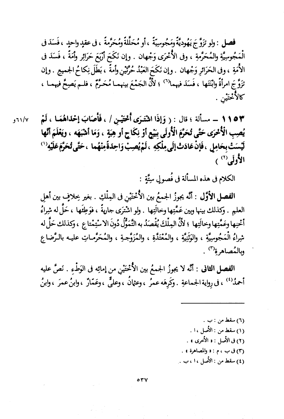 الفصل الأول: أنَّه يجوزُ الجمعُ بين الأُخْتَيْنِ فى المِلْكِ. بغير خِلافٍ بين أهلِ العلمِ. وكذلك بينها وبين عَمَّتِها وخالَتِها. ولو اشْترَى جاريةً، فوَطِئَها، حَلَّ له شِراءُ أخْتِها وعَمَّتِها وخالَتِها؛ لأنَّ المِلْكَ يُقْصَدُ به التَّمَوُّلُ دُونَ الاسْتِمْتاعِ، وكذلك حَلَّ له شِراءُ الْمَجُوسِيَّةِ، والوَثَنِيَّةِ، والمُعْتَدَّةِ، والمُزَوَّجةِ، والمُحَرَّماتِ عليه بالرَّضاعِ وبالمُصاهرةِ (٣).