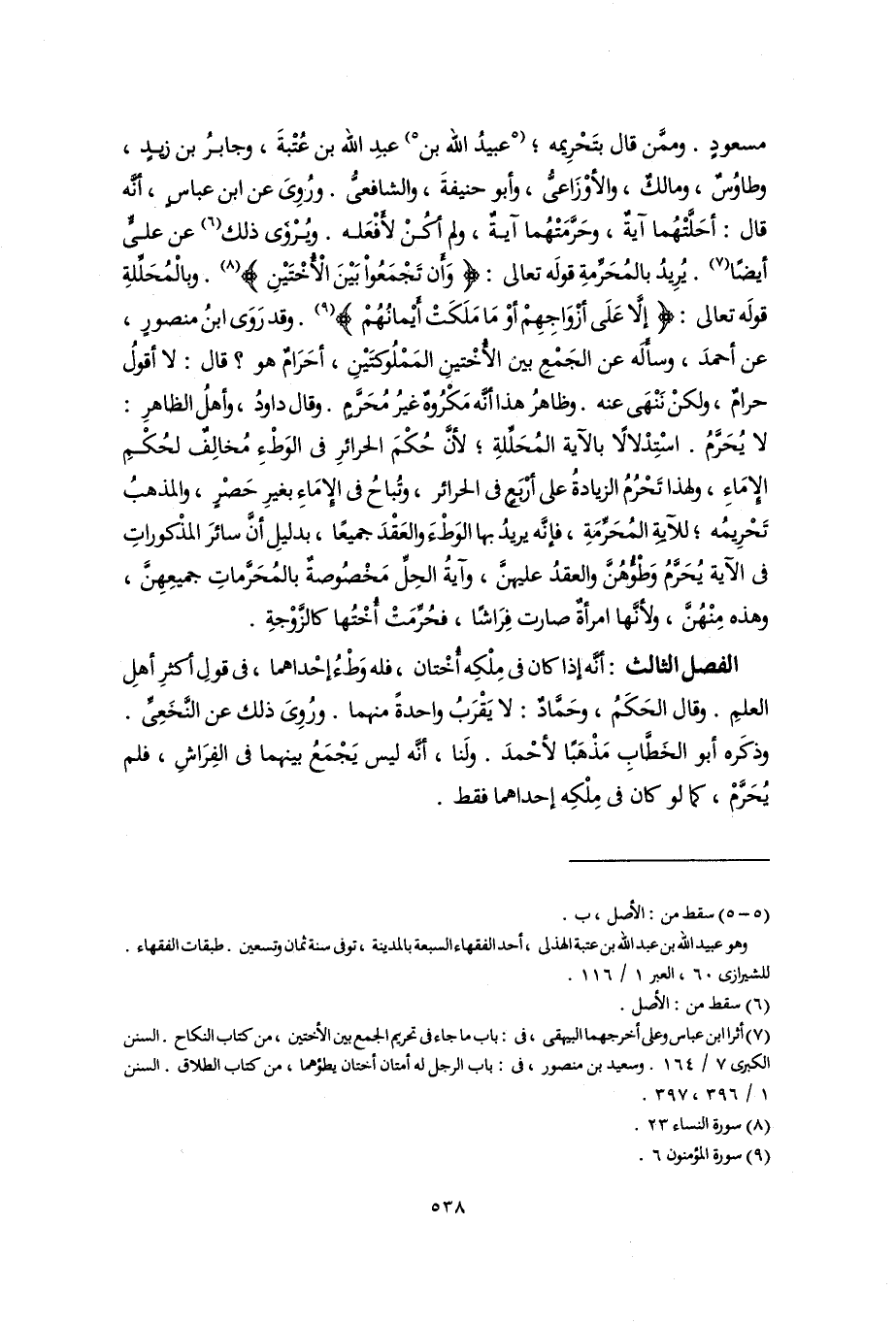 (٧) أثرا ابن عباس وعلى أخرجهما البيهقى، فى: باب ما جاء فى تحريم الجمع بين الأختين، من كتاب النكاح. السنن الكبرى ٧/ ١٦٤. وسعيد بن منصور، فى: باب الرجل له أمتان أختان يطؤهما، من كتاب الطلاق. السنن ١/ ٣٩٦، ٣٩٧.