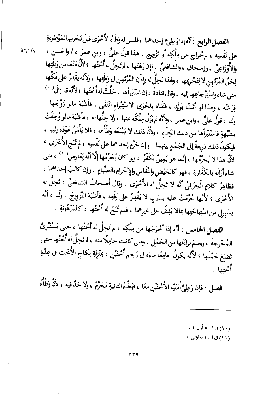 الفصل الرابع: أنَّه إذا وَطِئ إحداهما، فليس له وَطْءُ الأُخْرَى قبلَ تَحْريمِ المَوْطوءةِ على نَفْسِه، بإخْراجٍ عن مِلْكِه أو تَزْويجٍ. هذا قولُ علىٍّ، وابنِ عمرَ، والحسنِ، والأَوْزَاعِىِّ، وإسحاقَ، والشافعىِّ. فإنَّ رَهَنَها، لم تَحِلَّ له أُخْتُها؛ لأنَّ مَنْعَه من وَطْئِها لِحَقِّ المُرْتَهِنِ لا لِتَحْرِيمها، ولهذا يَحِلُّ له بإِذْنِ المُرْتَهنِ فى وَطْئِها، ولأنَّه يَقْدِرُ على فَكِّها متى شاء واسْتِرْجاعِها إليه. وقال قتادةُ: إن اسْتَبْرَأها، حَلَّتْ له أُخْتُها؛ لأنَّه قد زالَ (١٠) فِرَاشُه، ولهذا لو أتَتْ بوَلَدٍ، فنَفَاه بِدَعْوَى الاسْتِبْراءِ انتفَى، فأشْبَهَ ما لو زَوَّجَها. ولَنا، قولُ علىٍّ، وابنِ عمرَ، ولأنَّه لم يَزُلْ مِلْكُه عنها، ولا حِلُّها له، فأشْبَهَ ما لو وُطِئَتْ بشُبْهةٍ فاسْتَبْرأها من ذلك الوَطْءِ، ولأنَّ ذلك لا يَمْنَعُه وَطْأها، فلا يَأْمَنُ عَوْدَه إليها، فيكونُ ذلك ذَرِيعةً إلى الجَمْعِ بينهما. وإن حَرَّمَ إحداهما على نَفْسِه، لم تُبَحِ الأُخْرَى؛ لأنَّ هذا لا يُحَرِّمُها، إنَّما هو يَمِينٌ يُكَفّرُ، ولو كان يُحَرِّمُها إلَّا أنَّه لِعَارِضٍ (١١)، متى شاء أزَالَه بالكَفَّارةِ، فهو كالحَيْضِ والنِّفَاس والإحْرامِ والصِّيامِ. وإن كاتَبَ إحداهما، فظاهِرُ كلامِ الْخِرَقِىِّ أنَّه لا تَحِلُّ له الأُخْرَى. وقال أصحابُ الشافعىِّ: تَحِلُّ له الأُخْرَى؛ لأنَّها حُرِّمَتْ عليه بسَبَبٍ لا يَقْدِرُ على رَفْعِه، فأشْبَهَ التَّزْوِيجَ. ولَنا، أنَّه بسَبِيلٍ من اسْتِباحَتِها بما لا يَقِفُ على غيرِهما، فلم تُبَحْ له أُخْتُها، كالمَرْهُونةِ.