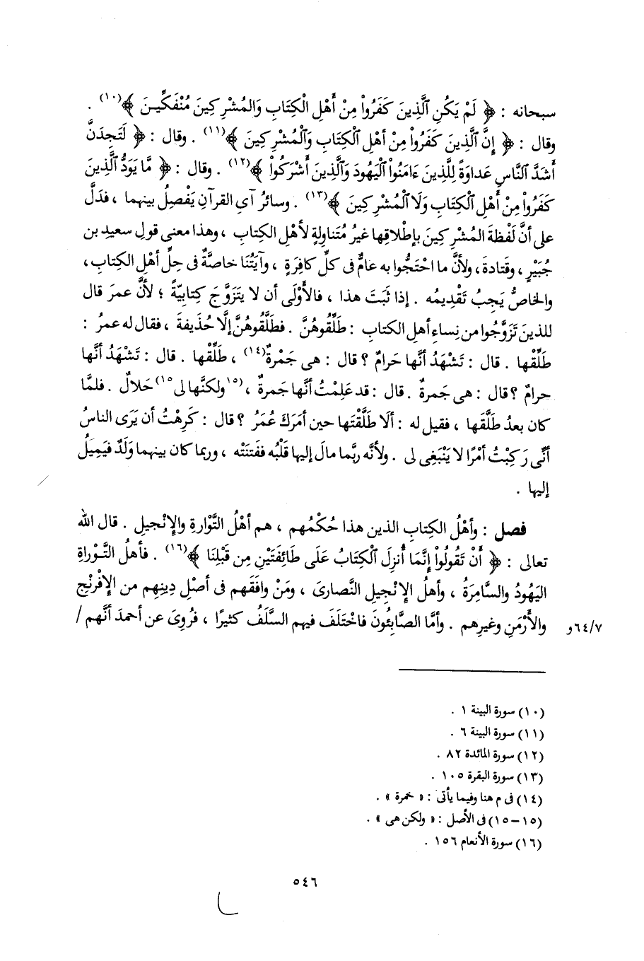 فصل: وأهْلُ الكِتابِ الذين هذا حُكْمُهم، هم أهْلُ التَّوْارةِ والإِنْجيلِ. قال اللَّه تعالى: {أَنْ تَقُولُوا إِنَّمَا أُنْزِلَ الْكِتَابُ عَلَى طَائِفَتَيْنِ مِنْ قَبْلِنَا} (١٦). فأهلُ التَّوْراةِ اليَهُودُ والسَّامِرَةُ، وأهلُ الإِنْجِيلِ النَّصارىَ، ومَنْ وافَقَهم فى أصْلِ دِينِهِم من الإفْرنْجِ والأَرْمَنِ وغيرِهم. وأمَّا الصَّابِئُونَ فاخْتَلَفَ فيهم السَّلَفُ كثيرًا، فرُوِىَ عن أحمدَ أنَّهم