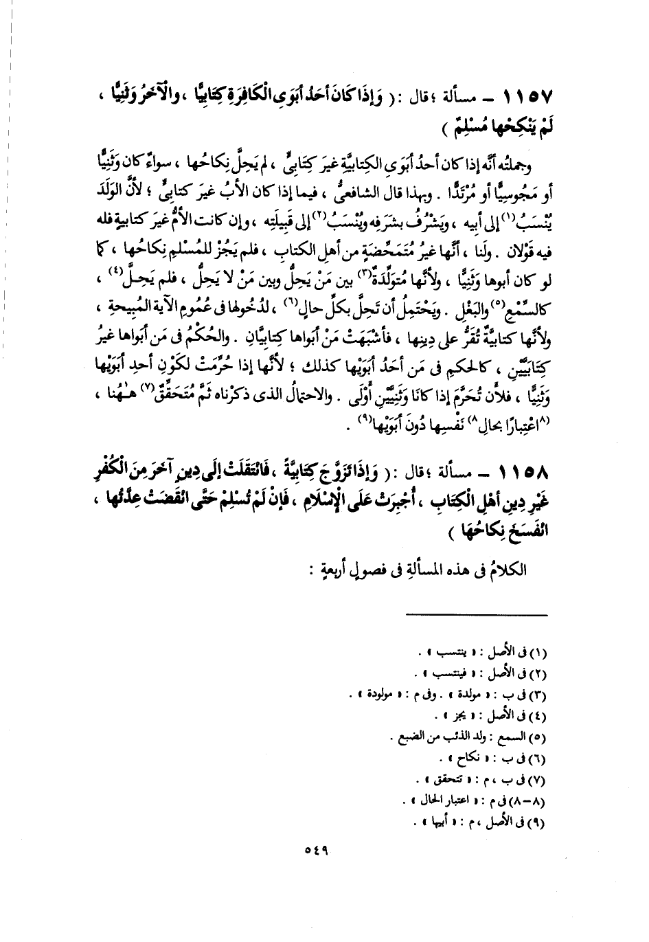 ١١٥٧ - مسألة؛ قال: (وَإِذَا كَانَ أَحَدُ أبَوَىِ الْكَافِرَةِ كِتَابِيًّا، والْآخَرُ وَثَنِيًّا، لَمْ يَنْكِحْها مُسْلِمٌ)