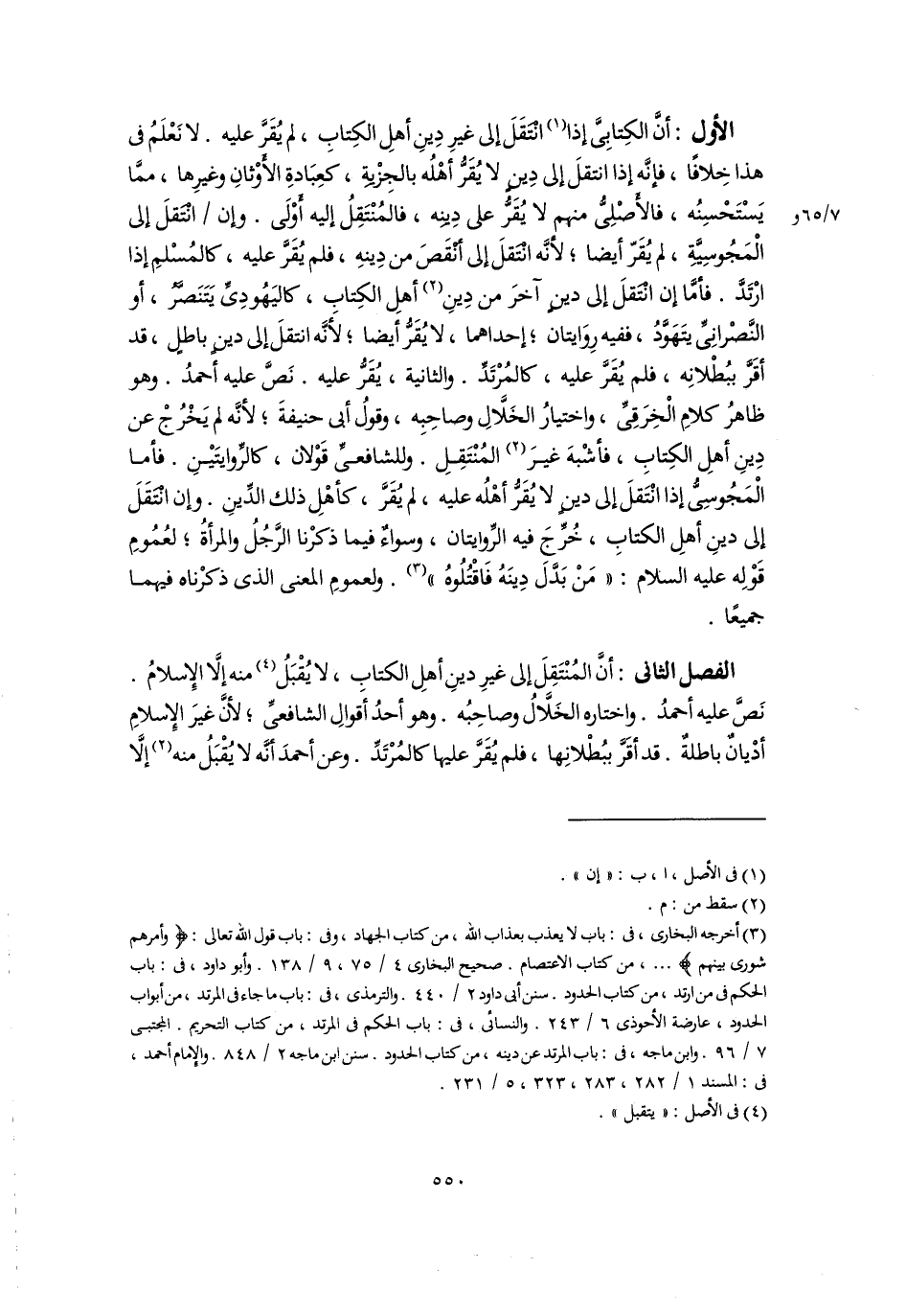 الفصل الثانى: أَنَّ المُنْتَقِلَ إلى غيرِ دينِ أهلِ الكتاب، لا يُقْبَلُ (٤) منه إلَّا الإِسلامُ. نَصَّ عليه أحمدُ. واختاره الخَلَّالُ وصاحِبُه. وهو أحدُ أقَوالِ الشافعىِّ؛ لأنَّ غيرَ الإِسلامِ أدْيانٌ باطلةٌ. قد أَقَرَّ ببُطْلانِها، فلم يُقَرَّ عليها كالمُرْتَدِّ. وعن أحمدَ أنَّه لا يُقْبَلُ منه (٢) إلَّا