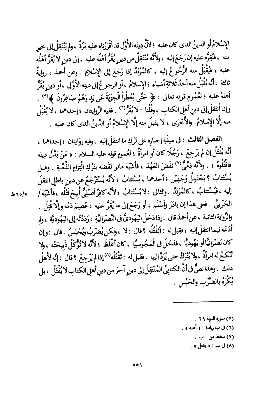 الفصل الثالث: فى صِفَةِ إجبارِه على تَرْكِ ما انتقلَ إليه. وفيه روَايتان؛ إحداهما، أنَّه يُقْتَلُ إن لم يَرْجِعْ، رَجُلًا كان أو امرأةً؛ لعُموم قوله عليه السلام: "مَنْ بَدَّلَ دِينَه فاقْتُلُوهُ". ولأنَّه ذِمِّىٌّ (٧) نَقَضَ العَهْدَ، فأشْبَهَ ما لو نَقَضَه بتَرْكِ الْتِزامِ الذِّمَّةِ. وهل يُسْتَتابُ؟ يَحْتَمِلُ وَجْهَيْن؛ أحدهما، يُسْتتابُ؛ لأنَّه يُسْتَرْجَعُ عن دينٍ باطلٍ انتقلَ إليه، فيُسْتتابُ، كالمُرْتَدِّ. والثانى: لا يُسْتَتابُ؛ لأنَّه كافِرٌ أصْلِىٌّ أُبِيحَ قَتْلُه، فأشْبَهَ الحَرْبِىَّ. فعلى هذا إن بادَرَ وأسْلَم، أو رَجَعَ إلى ما يُقَرُّ عليه، عُصِمَ دَمُه وإلَّا قُتِلَ. والرِّواية الثانية، عن أحمدَ قال: إذا دَخَلَ اليَهُودىُّ فى النَّصْرانيَّةِ، رَدَدْتُه إلى اليَهُوديَّةِ، ولم أدَعْه فيما انتقلَ إليه، فقِيل له: أتَقْتُلُه؟ قال: لا، ولكن يُضْرَبُ ويُحْبَسُ. قال: وإن كان نَصْرانيًّا أو يَهُوديًّا، فدَخَلَ فى الْمَجُوسيَّةِ، كان أغْلَظَ؛ لأنَّه لا تُؤْكَلُ ذَبِيحَتُه، ولا تُنْكَحُ له امرأةٌ، ولا يُتْرَكُ حتَّى يُرَدَّ إليها. فقيل له: تَقْتُلُه (٨) إذا لم يَرْجِعْ؟ قال: إنَّه لأَهلُ ذلك. وهذا نصٌّ فى أَنَّ الكتابِىَّ المُنْتَقِلَ إلى دينٍ آخرَ من دينِ أهلِ الكتابِ لا يُقْتَلُ، بل يُكْرَهُ بالضَّرْبِ والحَبْسِ.