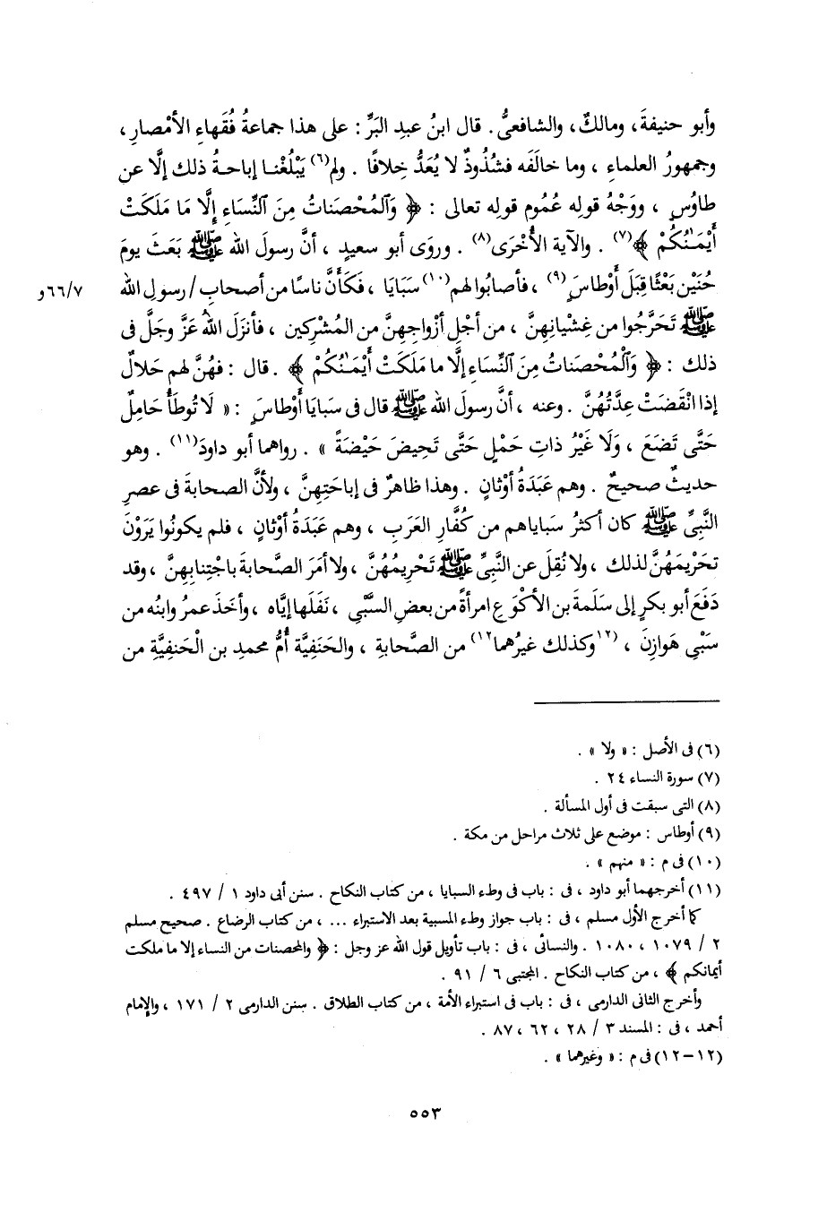 وأبو حنيفةَ، ومالكٌ، والشافعىُّ. قال ابنُ عبدِ البَرِّ: على هذا جماعةُ فُقَهاءِ الأمْصارِ، وجمهورُ العلماءِ، وما خالَفَه فشُذُوذٌ لا يُعَدُّ خِلافًا. ولم (٦) يَبْلُغْنا إباحةُ ذلك إلَّا عن طاوُسٍ، ووَجْهُ قولِه عُمُوم قولِه تعالى: {وَالْمُحْصَنَاتُ مِنَ النِّسَاءِ إِلَّا مَا مَلَكَتْ أَيْمَانُكُمْ} (٧). والآية الأُخْرَى (٨). وروَى أبو سعيدٍ، أَنَّ رسولَ اللَّه -صلى اللَّه عليه وسلم- بَعَثَ يومَ حُنَيْن بَعْثًا قِبَلَ أوْطاسٍ (٩)، فأصابُوا لهم (١٠) سَبَايَا، فَكَأَنَّ ناسًا من أصحابِ رسولِ اللَّه -صلى اللَّه عليه وسلم- تَحَرَّجُوا من غِشْيانِهِنَّ، من أجْلِ أزْواجِهِنَّ من المُشْركِين، فأنزَلَ اللَّهُ عَزَّ وجَلَّ فى ذلك: {وَالْمُحْصَنَاتُ مِنَ النِّسَاءِ إِلَّا مَا مَلَكَتْ أَيْمَانُكُمْ}. قال: فهُنَّ لهم حَلالٌ إذا انْقَضَتْ عِدَّتُهُنَّ. وعنه، أَنَّ رسولَ اللَّه -صلى اللَّه عليه وسلم- قال فى سَبايَا أَوْطاسٍ: "لَا تُوطَأُ حَامِلٌ حَتَّى تَضَعَ، وَلَا غَيْرُ ذاتِ حَمْلٍ حَتَّى تَحِيضَ حَيْضَةً". رواهما أبو داودَ (١١). وهو حديثٌ صحيحٌ. وهم عَبَدَةُ أوْثانٍ. وهذا ظاهرٌ فى إباحَتِهِنَّ، ولأنَّ الصحابةَ فى عصرِ النَّبِىِّ -صلى اللَّه عليه وسلم- كان أكثرُ سَباياهم من كُفَّارِ العَرَبِ، وهم عَبَدَةُ أوْثانٍ، فلم يكونُوا يَرَوْنَ تحَرْيمَهُنَّ لذلك، ولا نُقِلَ عن النَّبِىِّ -صلى اللَّه عليه وسلم- تَحْرِيمُهُنَّ، ولا أمَرَ الصَّحابةَ باجْتِنابِهِنَّ، وقد دَفَعَ أبو بكرٍ إلى سَلَمةَ بن الأكْوَعِ امرأةً من بعضِ السَّبْىِ، نَفَلَها إيَّاه، وأخَذَ عمرُ وابنُه من سَبْىِ هَوازِنَ، [وكذلك غيرُهما] (١٢) من الصَّحابةِ، والحَنَفِيَّة أُمُّ محمدِ بن الْحَنفِيَّةِ من