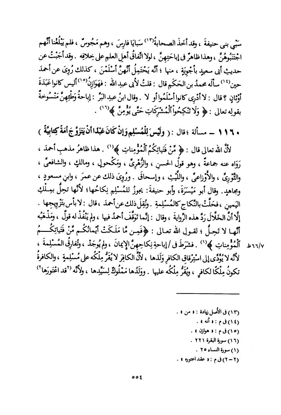 سَبْى بنى حنيفةَ، وقد أخَذَ الصحابةُ (١٣) سَبايَا فارِسَ، وهم مَجُوسٌ، فلم يَبْلُغْنا أنَّهم اجْتَنَبُوهُنَّ، وهذا ظاهرٌ فى إباحَتِهِنَّ، لولا اتِّفاقُ أهلِ العلمِ على خِلافِه. وقد أجَبْتُ عن حديثِ أبى سعيدٍ بأجْوِبَةٍ، منها؛ أنَّه يَحْتَمِلُ أنَّهنَّ أسْلَمْنَ، كذلك رُوِىَ عن أحمدَ حين (١٤) سألَه محمدُ بن الحَكَمِ قال: قلتُ لأبى عبدِ اللَّه: فهَوَازِنُ (١٥) أليس كانوا عَبَدَةَ أوْثانٍ؟ قال: لا أدْرِى كانوا أسْلَمُوا أو لا. وقال ابنُ عبدِ البَرِّ: إباحةُ وَطْئِهِنَّ مَنْسُوخةٌ بقولِه تعالى: {وَلَا تَنْكِحُوا الْمُشْرِكَاتِ حَتَّى يُؤْمِنَّ} (١٦).