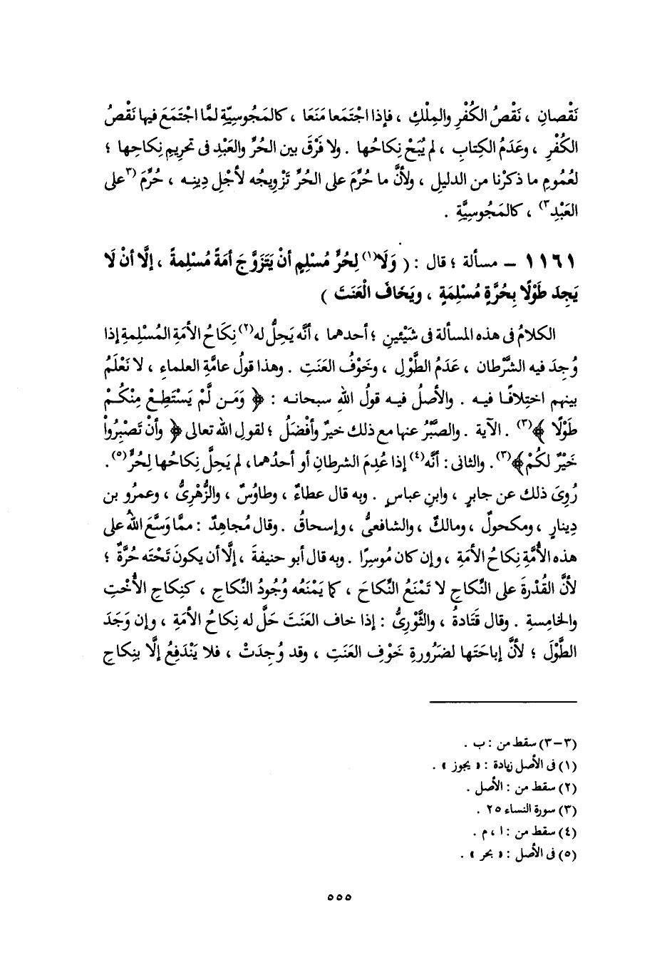 ١١٦١ - مسألة؛ قال: (وَلَا (١) لِحُرٍّ مُسْلِمٍ أَنْ يَتَزَوَّجَ أَمَةً مُسْلِمةً، إِلَّا أَنْ لَا يَجِدَ طَوْلًا بِحُرَّةٍ مُسْلِمَةٍ، ويَخَافَ الْعَنَتَ)