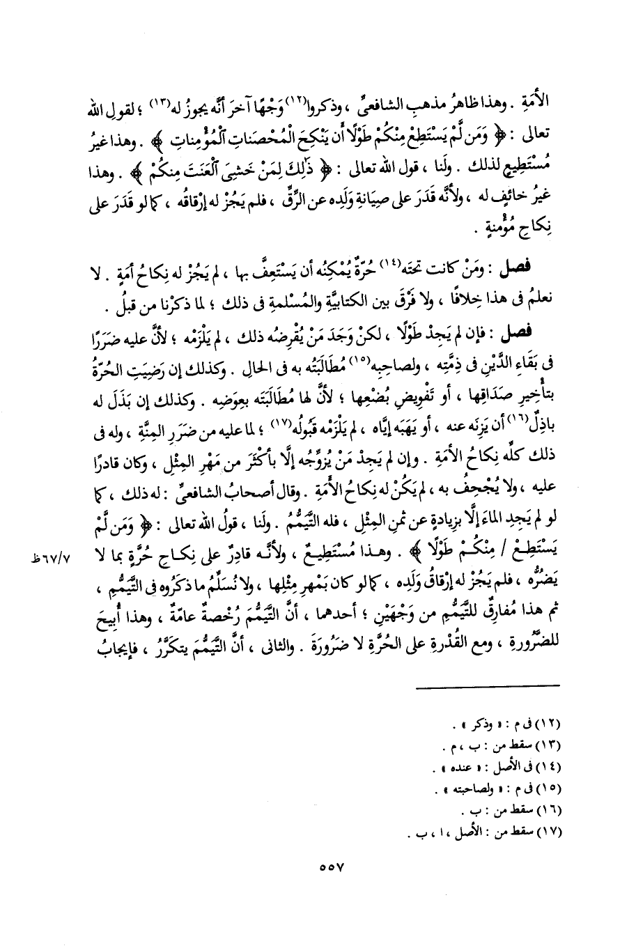 فصل: فإن لم يَجِدْ طَوْلًا، لكنْ وَجَدَ مَنْ يُقْرِضُه ذلك، لم يَلْزَمْه؛ لأنَّ عليه ضَرَرًا فى بَقَاءِ الدَّيْنِ فى ذِمَّتِه، ولصاحِبِه (١٥) مُطَالَبَتُه به فى الحالِ. وكذلك إن رَضِيَتِ الحُرّةُ بتأْخِيرِ صَدَاقِها، أو تَفْوِيضِ بُضْعِها؛ لأنَّ لها مُطَالَبَتَه بعِوَضِه. وكذلك إن بَذَلَ له باذِلٌ (١٦) أن يَزِنَه عنه، أو يَهَبَه إيَّاه، لم يَلْزَمْه قَبُولُه (١٧)؛ لما عليه من ضَرَرِ المِنَّةِ، وله فى ذلك كلِّه نِكاحُ الأَمَةِ. وإن لم يَجِدْ مَنْ يُزوِّجُه إلَّا بأكْثَرَ من مَهْرِ المِثْلِ، وكان قادرًا عليه، ولا يُجْحِفُ به، لم يَكُنْ له نِكاحُ الأَمَةِ. وقال أصحابُ الشافعىِّ: له ذلك، كما لو لم يَجِدِ الماءَ إلَّا بزِيادةٍ عن ثمنِ المِثْلِ، فله التَّيَمُّمُ. ولَنا، قولُ اللَّه تعالى: {وَمَنْ لَمْ يَسْتَطِعْ مِنْكُمْ طَوْلًا}. وهذا مُسْتَطِيعٌ، ولأنَّه قادِرٌ على نِكاحِ حُرَّةٍ بما لا يَضُرُّه، فلم يَجُزْ له إرْقاقُ وَلَدِه، كما لو كان بَمْهرِ مِثْلِها، ولا نُسَلِّمُ ما ذكَرُوه فى التَّيَمُّمِ، ثم هذا مُفارِقٌ للتَّيَمُّمِ من وَجْهَيْنِ؛ أحدهما، أَنَّ التَّيَمُّمَ رُخْصةٌ عامّةٌ، وهذا أُبِيحَ للضَّرُورةِ، ومع القُدْرةِ على الحُرَّةِ لا ضَرُورَةَ. والثانى، أَنَّ التَّيَمُّمَ يتكَرَّرُ، فإيجابُ