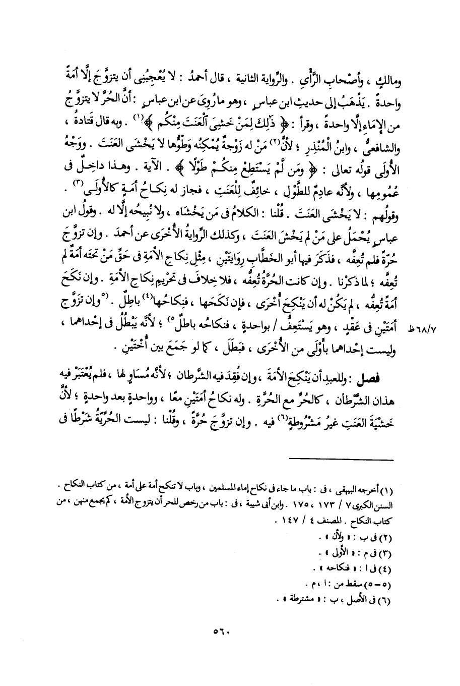 فصل: وللعبدِ أن يَنْكِحَ الأمَةَ، وإن فُقِدَ فيه الشَّرطان؛ لأنَّه مُسَاوٍ لها، فلم يُعْتَبَرْ فيه هذان الشَّرْطان، كالحُرِّ مع الحُرَّةِ. وله نكاحُ أمَتَيْنِ معًا، وواحدةٍ بعد واحدةٍ؛ لأنَّ خَشْيَةَ العَنَتِ غيرُ مَشْرُوطةٍ (٦) فيه. وإن تزوَّجَ حُرَّةً، وقُلْنا: ليست الحُرِّيّةُ شَرْطًا فى