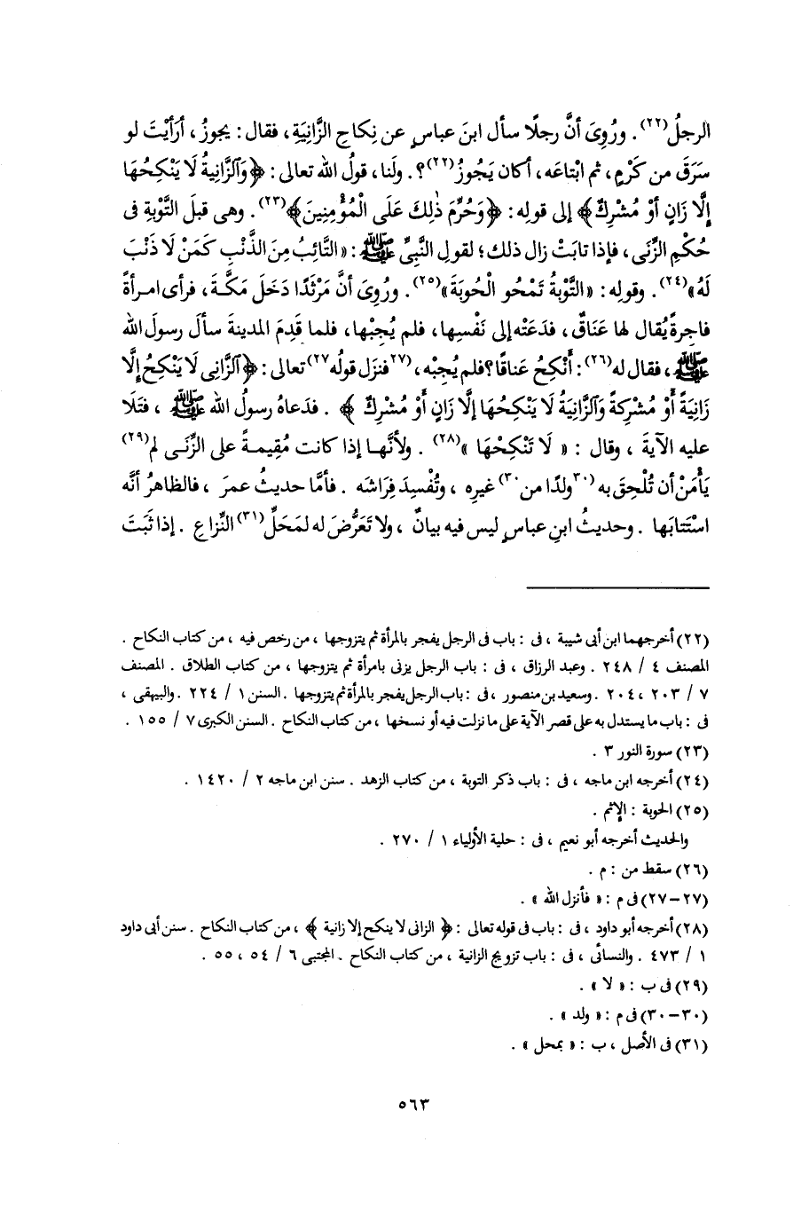 (٢٢) أخرجهما ابن أبى شيبة، فى: باب فى الرجل يفجر بالمرأة ثم يتزوجها، من رخص فيه، من كتاب النكاح. المصنف ٤/ ٢٤٨. وعبد الرزاق، فى: باب الرجل يزنى بامرأة ثم يتزوجها، من كتاب الطلاق. المصنف ٧/ ٢٠٣، ٢٠٤. وسعيد بن منصور، فى: باب الرجل يفجر بالمرأة ثم يتزوجها. السنن ١/ ٢٢٤. والبيهقى، فى: باب ما يستدل به على قصر الآية على ما نزلت فيه أو نسخها، من كتاب النكاح. السنن الكبرى ٧/ ١٥٥.
