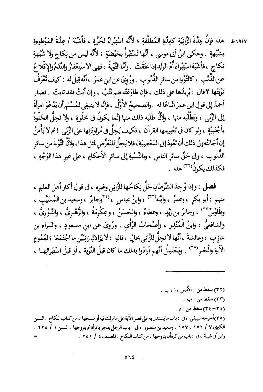 فصل: وإذا وُجِدَ الشَّرْطانِ حَلَّ نِكاحُها للزَّانِى وغيرِه، فى قولِ أكثر أهل العلمِ، منهم: أبو بكر، وعمرُ، وابْنُه (٣٣)، وابنُ عباسٍ، [وجابرٌ، وسعيد بن المُسَيَّبِ، وطَاوُسٌ] (٣٤)، وجابرُ بن زَيْدٍ، وعطاءٌ، والحَسَنُ، وعِكْرِمَةُ، والزُّهْرِىُّ، والثَّوْرِىُّ، والشافعىُّ، وابنُ الْمُنْذِرِ، وأصْحابُ الرَّأْىِ. ورُوِىَ عن ابنِ مسعودٍ، والبَراءِ بن عازِبٍ، وعائشةَ، أنَّها لا تَحِلُّ للزَّانِى بحالٍ، قالوا: لا يَزَالانِ زانِيَيْنِ ما اجْتَمَعَا؛ لعُمُومِ الآيةِ والْخَبرِ (٣٥). ويَحْتَمِلُ أنَّهم أرادُوا بذلك ما كان قبلَ التَّوْبةِ، أو قبلَ اسْتِبْرائِها،