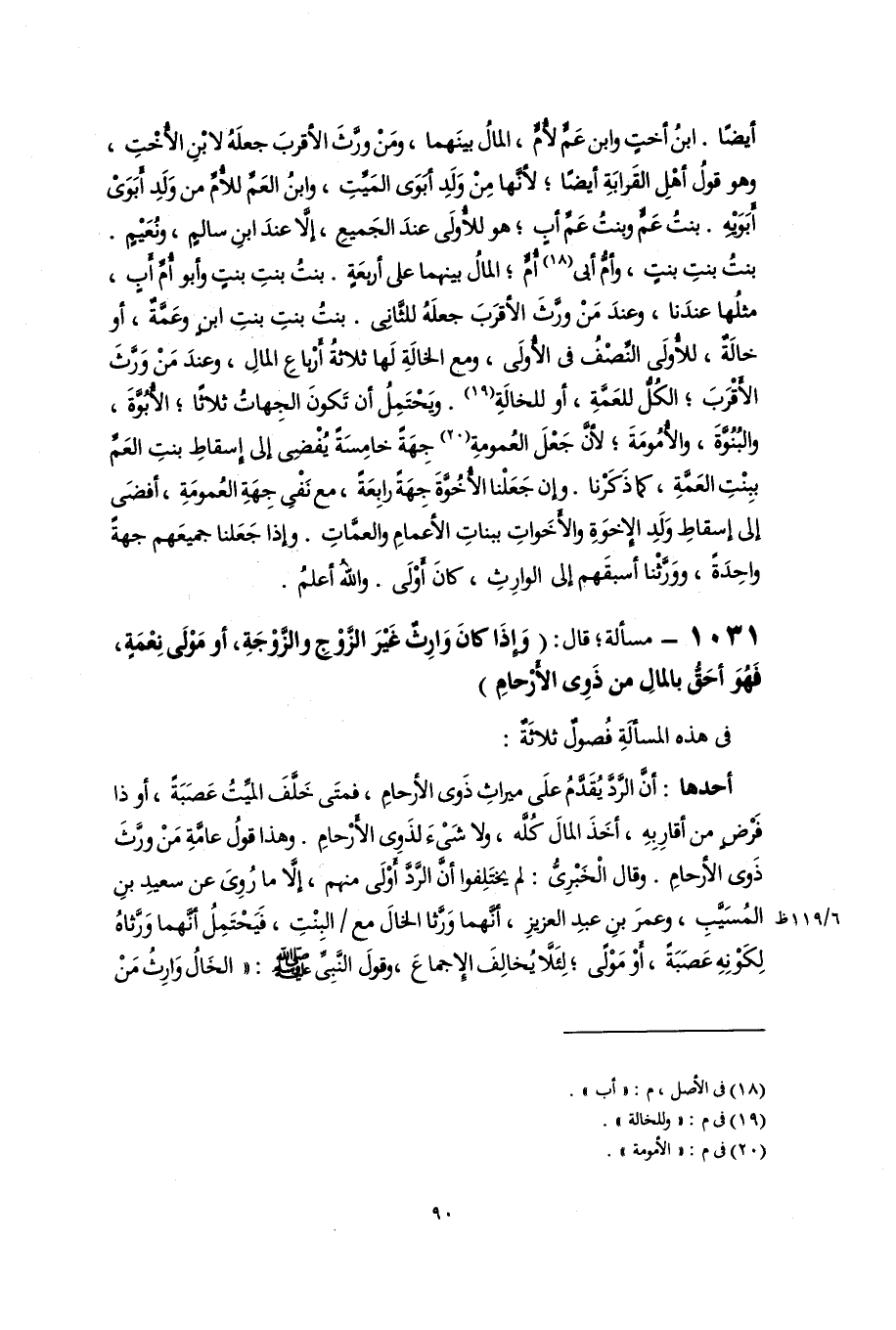 أيضًا. ابنُ أختٍ وابن عَمٍّ لأُمٍّ، المالُ بينَهما، ومَنْ ورَّثَ الأقربَ جعلَهُ لابْنِ الأُخْتِ، وهو قولُ أهْلِ القَرابَةِ أيضًا؛ لأنَّها مِنْ وَلَدِ أبَوَى المَيِّتِ، وابنُ العَمِّ للأُمِّ من وَلَدِ أَبَوَىْ أَبَوَيْهِ. بنتُ عَمٍّ وبنتُ عَمِّ أبٍ؛ هو للأُولَى عندَ الجَميعِ، إلَّا عندَ ابنِ سالمٍ، ونُعَيْمٍ. بنتُ بنتِ بنتٍ، وأمُّ أبى (١٨) أُمٍّ؛ المالُ بينهما على أربعَةٍ. بنتُ بنتِ بنتٍ وأبو أُمِّ أَبٍ، مثلُها عندَنا، وعندَ مَنْ ورَّثَ الأقرَبَ جعلَهُ للثَّانِى. بنتُ بنتِ بنتِ ابنٍ وعَمَّةٌ، أو خالَةٌ، للأُولَى النِّصْفُ في الأُولَى، ومع الخالَةِ لَها ثلاثةُ أَرْباعِ المالِ، وعندَ مَنْ وَرَّثَ الأَقْرَبَ؛ الكُلُّ للعَمَّةِ، أو للخالَةِ (١٩). ويَحْتَمِلُ أن تَكونَ الجِهاتُ ثلاثًا؛ الأُبُوَّةَ، والبُنُوَّةَ، والأُمُومَةَ؛ لأنَّ جَعْلَ العُمومةِ (٢٠) جِهَةً خامِسَةً يُفضِى إلى إِسقاطِ بنتِ العَمِّ ببِنْتِ العَمَّةِ، كما ذَكَرْنا. وإن جَعَلْنا الأُخُوَّةَ جِهَةً رابِعَةً، مع نَفْىِ جِهَةِ العُمومَةِ، أفضَى إلى إسقاطِ وَلَدِ الإِخوَةِ والأَخَواتِ ببناتِ الأعمامِ والعمَّاتِ. وإذا جَعَلنا جميعَهم جهةً واحِدَةً، ووَرَّثْنا أسبقَهم إلى الوارِثِ، كانَ أَوْلَى. واللهُ أعلمُ.
