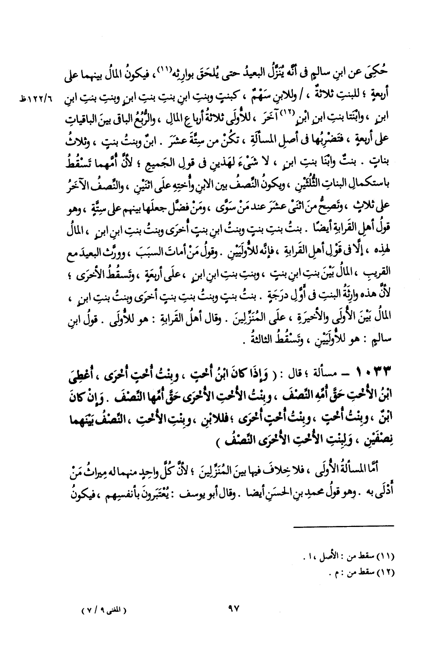 حُكِىَ عن ابنِ سالمٍ في أنَّه يُنَزَّلُ البعيدُ حتى يُلحَقَ بوارِثِه (١١)، فيكونُ المالُ بينهما على أربعةٍ؛ للبنتِ ثلاثةٌ، وللابنِ سَهْمٌ، كبنتٍ وبنتِ ابنِ بنتِ بنتِ ابنٍ وبنتِ بنتِ ابنِ ابنٍ، وابْنَتا بنتِ ابنِ ابْنٍ (١٢) آخَرَ، للأُولَى ثلاثةُ أرباعِ المالِ، والرُّبُعُ الباقى بينَ الباقياتِ على أربعةٍ، فتَضْرِبُها في أصلِ المسألَةِ، تكُنْ من سِتَّةَ عشَرَ. ابنٌ وبنتُ بنتٍ، وثلاثُ بناتٍ. بنتٌ وابْنَا بنتِ ابنٍ، لا شَىْءَ لهَذينِ في قولِ الجَميعِ؛ لأنَّ أُمَّهما تَسْقُطُ باستكمالِ البناتِ الثُّلُثَيْنِ، ويكونُ النِّصفُ بين الابنِ وأُختِهِ علَى اثنَيْنِ، والنَّصفُ الآخَرُ على ثلاثٍ، وتَصِحُّ منَ اثنَىْ عشَرَ عند مَنْ سَوَّى، ومَنْ فضَّل جعلَها بينهم على سِتَّةٍ، وهو قولُ أهلِ القَرابةِ أيضًا. بنتُ بنتِ بنتٍ وبنتُ ابنِ بنتٍ أُخرَى وبنتُ بنتِ ابنِ ابنٍ، المالُ لهذِه، إلَّا في قَوْلِ أهلِ القَرابةِ، فإنَّه للأُولَيَيْنِ. وقولُ مَنْ أماتَ السبَبَ، وورَّث البعيدَ مع القريبِ، المالُ بَيْنَ بنتِ ابنِ بنتٍ، وبنتِ بنتِ ابنِ ابنٍ، علَى أربعَةٍ، وتَسقُطُ الأخرَى؛ لأنَّ هذه وارِثَةُ البنتِ في أَوَّلِ درَجَةٍ. بنتُ بنتٍ وبنتُ بنتِ بنتٍ أخرَى وبنتُ بنتِ ابنٍ، المالُ بَيْنَ الأُولَى والأخيرَةِ، علَى المُنَزِّلِينَ. وقال أهلُ القَرابةِ: هو للأُولَى. قولُ ابنِ سالمٍ: هو للأُولَيَيْنِ، وتَسْقُطُ الثالثةُ.