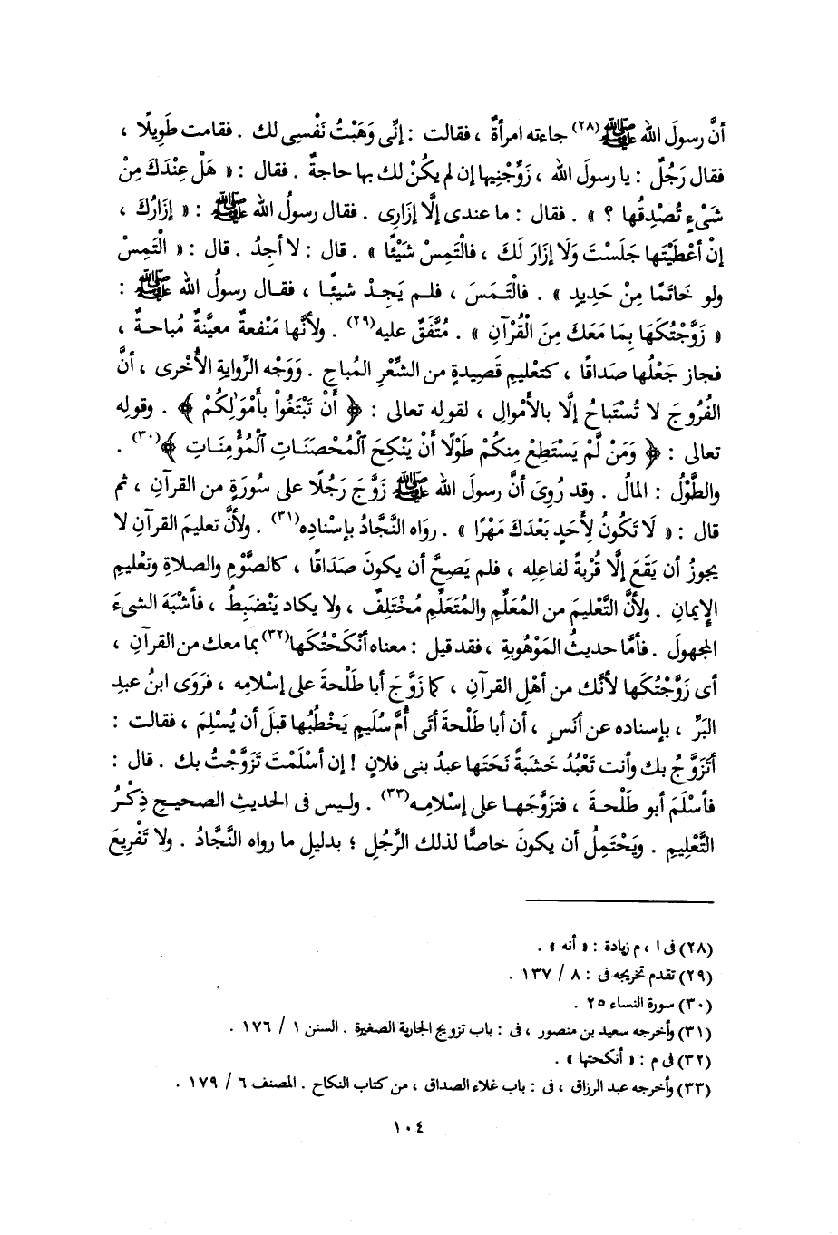 أَنَّ رسولَ اللَّه -صلى اللَّه عليه وسلم- (٢٨) جاءته امرأةٌ، فقالت: إنِّى وَهَبْتُ نَفْسِى لك. فقامت طَوِيلًا، فقال رَجُلٌ: يا رسولَ اللَّه، زَوِّجْنِيها إن لم يكُنْ لك بها حاجةٌ. فقال: "هَلْ عِنْدَكَ مِنْ شَىْءٍ تُصْدِقُها؟ ". فقال: ما عندى إِلَّا إزَارِى. فقال رسولُ اللَّه -صلى اللَّه عليه وسلم-: "إِزَارُكَ، إنْ أعْطتَها جَلَسْتَ وَلَا إِزَارَ لَكَ، فالْتَمِسْ شَيْئًا". قال: لا أجِدُ. قال: "الْتَمِسْ ولو خَاتَمًا مِنْ حَدِيدٍ". فالْتَمَسَ، فلم يَجِدْ شيئًا، فقال رسُولُ اللَّه -صلى اللَّه عليه وسلم-: "زَوَّجْتُكَهَا بِمَا مَعَكَ مِنَ الْقُرآنِ". مُتَّفَقٌ عليه (٢٩). ولأنَّها مَنْفعةٌ معيَّنةٌ مُباحةٌ، فجاز جَعْلُها صَداقًا، كتعْليمِ قَصِيدة من الشِّعْرِ المُباح. وَوَجْه الرِّوايةِ الأُخْرى، أَنَّ الفُرُوجَ لا تُسْتَباح إلَّا بالأَمْوالِ، لقولِه تعالى: {أَنْ تَبْتَغُوا بِأَمْوَالِكُمْ}. وقولِه تعالى: {وَمَنْ لَمْ يَسْتَطِعْ مِنْكُمْ طَوْلًا أَنْ يَنْكِحَ الْمُحْصَنَاتِ الْمُؤْمِنَاتِ} (٣٠). والطَّوْلُ: المالُ. وقد رُوِىَ أَنَّ رسولَ اللَّه -صلى اللَّه عليه وسلم- زَوَّجَ رَجُلًا على سُورَةٍ من القرآنِ، ثم قال: "لَا تَكُونُ لِأَحَدٍ بَعْدَكَ مَهْرًا". روَاه النَّجَّادُ بإِسْنادِه (٣١). ولأنَّ تعليمَ القرآنِ لا يجوزُ أن يَقَع إِلَّا قُرْبةً لفاعِلِه، فلم يَصِحَّ أن يكونَ صَدَاقًا، كالصَّوْمِ والصلاةِ وتعْليمِ الإيمانِ. ولأنَّ التَّعْليمَ من المُعَلِّمِ والمُتَعَلِّمِ مُخْتَلِفٌ، ولا يكاد يَنْضَبِطُ، فأشْبَهَ الشىءَ المجهولَ. فأمَّا حديثُ المَوْهُوبةِ، فقد قيل: معناه أنْكَحْتُكَها (٣٢) بما معك من القرآنِ، أى زَوَّجْتُكَها لأنَّك من أهْلِ القرآنِ، كا زَوَّجَ أبا طَلْحةَ على إسْلامِه، فرَوَى ابنُ عبدِ البَرِّ، بإسناده عن أنَسٍ، أن أبا طَلْحةَ أرتَى أُمَّ سُلَيمٍ يَخْطُبُها قبلَ أن يُسْلِمَ، فقالت: أتَزَوَّجُ بك وأنت تَعْبُدُ خَشَبةً نَحَتَها عبدُ بنى فلانٍ! إن أسْلَمْتَ تَزَوَّجْتُ بك. قال: فأسْلَمَ أبو طَلْحةَ، فتزَوَّجَها على إسْلامِه (٣٣). وليس فى الحديثِ الصحيحِ ذِكْرُ التَّعْلِيمِ. يحْتَمِل أن يكونَ خاصًّا لذلك الرَّجُلِ؛ بدليلِ ما رواه النَّجَّادُ. ولا تَفْرِيعَ