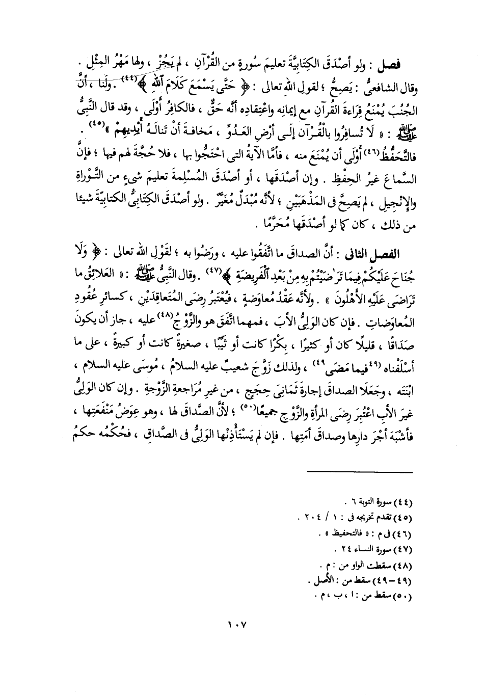 فصل: ولو أصْدَقَ الكِتَابِيَّةَ تعليمَ سُورةٍ من القُرْآنِ، لم يَجُزْ، ولها مَهْرُ المِثْلِ. وقال الشافعىُّ: يَصِحُّ؛ لقولَ اللَّهِ تعالى: {حَتَّى يَسْمَعَ كَلَامَ اللَّهِ} (٤٤). ولَنا، أَنَّ الجُنُبَ يُمْنَعُ قِرَاءةَ القُرآنِ مع إيمانِه واعْتِقادِه أنَّه حَقٌّ، فالكافِرُ أَوْلَى، وقد قال النَّبِىُّ -صلى اللَّه عليه وسلم-: "لَا تُسافِرُوا بالْقُرْآن إلَى أرْضِ العَدُوِّ، مَخافةَ أنْ تَنالَهُ أَيْدِيهِمْ" (٤٥). فالتَّحَفُّظُ (٤٦) أَوْلَى أن يُمْنَعَ منه، فأمَّا الآيةُ التى احْتَجُّوا بها، فلا حُجَّةَ لهم فيها؛ فإنَّ السَّماعَ غيرُ الحِفْظِ. وإن أصْدَقَها، أو أصْدَقَ المُسْلِمةَ تعليمَ شىءٍ من التَّوْراةِ والإِنْجِيلِ، لم يَصِحَّ فى المَذْهَبَيْنِ؛ لأنَّه مُبْدَل مُغَيَّرٌ. ولو أصْدَقَ الكِتَابِىُّ الكتابِيّةَ شيئا من ذلك، كان كما لو أصْدَقَها مُحَرَّمًا.
