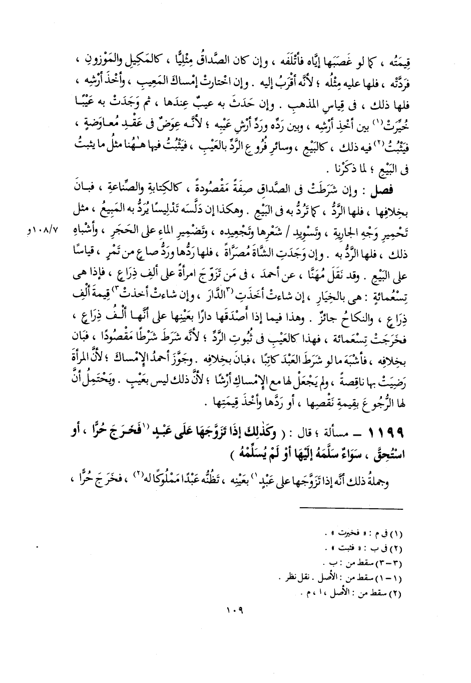 فصل: وإن شَرَطَتْ فى الصَّداقِ صِفَةً مَقْصُودةً، كالكِتابةِ والصِّناعةِ، فبانَ بخِلافِها، فلها الرَّدُّ، كما تَرُدُّ به فى البَيْعِ. وهكذا إن دَلَّسَه تَدْلِيسًا يُرَدُّ به المَبِيعُ، مثل تَحْمِيرِ وَجْهِ الجارِيةِ، وتَسْوِيِد شَعْرِها وتَجْعِيدِه، وتَضْمِيرِ الماءِ على الحَجَرِ، وأشْباهِ ذلك، فلها الرَّدُّ به. وإن وَجَدَتِ الشَّاةَ مُصَرَّاةً، فلها رَدُّها ورَدُّ صاعٍ من تَمْرٍ، قياسًا على البَيْعِ. وقد نَقَلَ مُهَنَّا، عن أحمدَ، فى مَن تَزَوّجَ امرأةً على ألفِ ذِرَاعٍ، فإذا هى تِسْعُمائةٍ: هى بالخِيَارِ، إن شاءتْ أخَذَتِ [الدَّارَ، وإن شاءتْ أخذتْ] (٣) قِيمةَ ألْفِ ذِرَاع، والنكاحُ جائزٌ. وهذا فيما إذا أصْدَقَها دارًا بعَيْنِها على أنَّها ألْفُ ذِرَاعٍ، فخَرَجَتْ تِسْعَمائة، فهذا كالعَيْبِ فى ثُبُوتِ الرَّدِّ؛ لأنَّه شَرَطَ شَرْطًا مَقْصُودًا، فبَان بخِلافِه، فأشْبَهَ ما لو شَرَطَ العَبْدَ كاتِبًا، فبانَ بخِلافِه. وجَوَّزَ أحمدُ الإِمْساكَ؛ لأنَّ المرأةَ رَضِيَتْ بها ناقِصةً، ولم يَجْعَلْ لها مع الإِمْساكِ أرْشًا؛ لأنَّ ذلك ليس بعَيْبٍ. ويَحْتَمِلُ أَنَّ لها الرُّجُوعَ بقِيمةِ نَقْصِها، أو رَدَّها وأخْذَ قِيمَتِها.