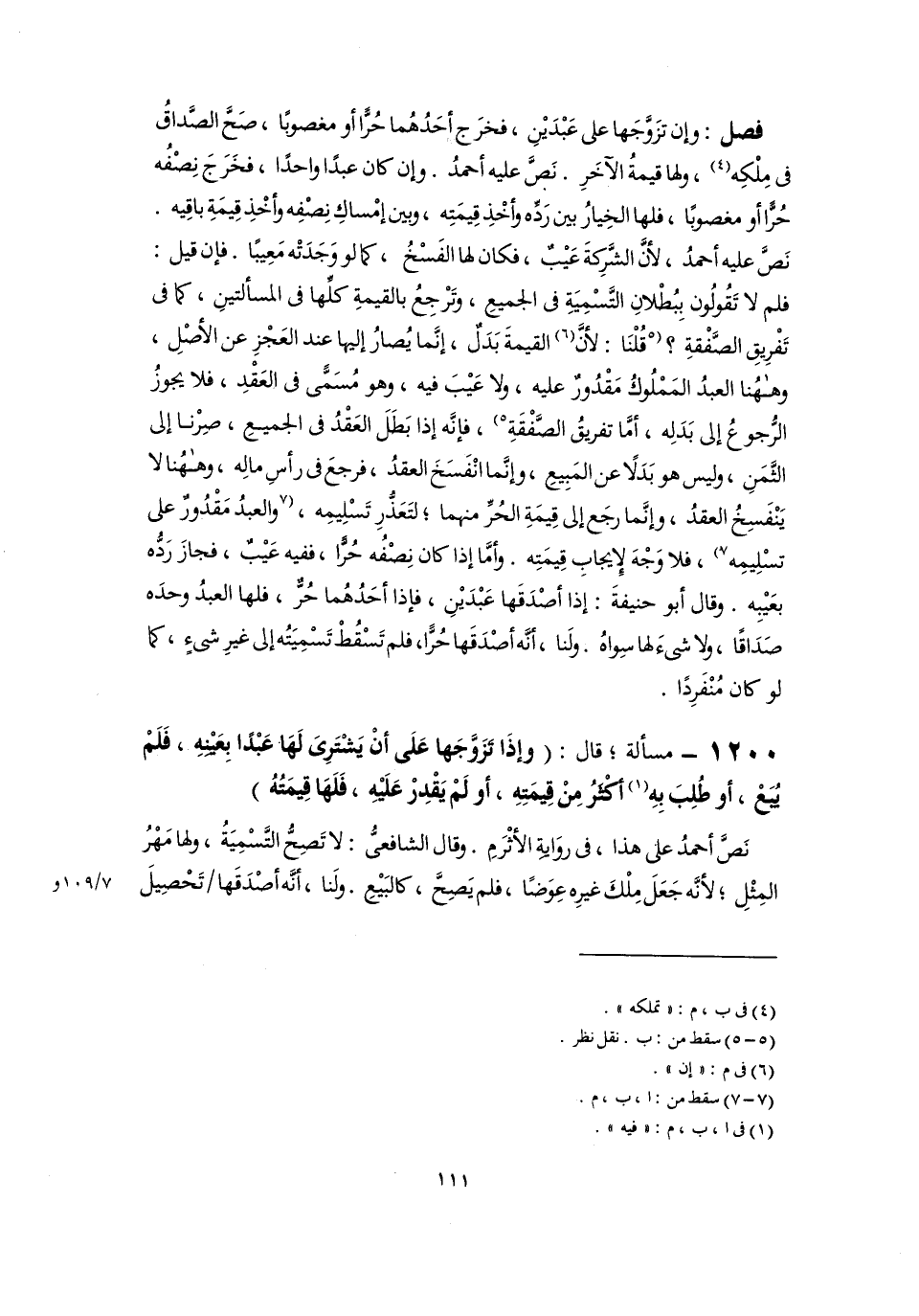 فصل: وإن تزَوَّجَها على عَبْدَيْنِ، فخرَج أحَدُهُما حُرًّا أو مغصوبًا، صَحَّ الصَّداقُ فى مِلْكِه (٤)، ولها قيمةُ الآخَرِ. نَصَّ عليه أحمدُ. وإن كان عبدًا واحدًا، فخَرَجَ نِصْفُه حُرًّا أو مغصوبًا، فلها الخِيارُ بين رَدِّه وأخْذِ قِيمَتِه، وبين إمْساكِ نِصْفِه وأخْذِ قِيمَةِ باقِيه. نَصَّ عليه أحمدُ؛ لأنَّ الشَّركِةَ عَيْبٌ، فكان لها الفَسْخُ، كما لو وَجَدَتْه مَعِيبًا. فإن قيل: فلم لا تَقُولُون بِبُطْلانِ التَّسْمِيَةِ فى الجميعِ، وتَرْجِعُ بالقيمةِ كلها فى المسألتينِ، كما فى تَفْرِيقِ الصَّفْقةِ؟ [قُلْنَا: لأنَّ (٥) القيمةَ بَدَلٌ، إنَّما يُصارُ إليها عند العَجْزِ عن الأصْلِ، وههُنا العبدُ المَمْلُوكُ مَقْدُورٌ عليه، ولا عَيْبَ فيه، وهو مُسَمًّى فى العَقْدِ، فلا يجوزُ الرُّجوعُ إلى بَدَلِه، أمَّا تفريقُ الصَّفْقَةِ] (٦)، فإنَّه إذا بَطَلَ العَقْدُ فى الجميعِ، صِرْنا إلى الثَّمَنِ، وليس هو بَدَلًا عن المَبِيعِ، وإنَّما انْفَسَخَ العقدُ، فرجعَ فى رأسِ مالِه، وههُنا لا يَنْفَسِخُ العقدُ، وإنَّما رجَع إلى قِيمَةِ الحُرِّ منهما؛ لتَعَذُّرِ تَسْلِيمِه، [والعبدُ مَقْدُورٌ على تسْلِيمِه] (٧)، فلا وَجْهَ لإِيجابِ قِيمَتِه. وأمَّا إذا كان نِصْفُه حُرًّا، ففيه عَيْبٌ، فجازَ رَدُّه بعَيْبِه. وقال أبو حنيفةَ: إذا أصْدَقَها عَبْدَيْنِ، فإذا أحَدُهُما حُرٌّ، فلها العبدُ وحدَه صَدَاقًا، ولا شىءَ لها سِواهُ. ولَنا، أنَّه أصْدَقَها حُرًّا، فلم تَسْقُطْ تَسْمِيَتُه إلى غيرِ شىءٍ، كما لو كان مُنْفَرِدًا.