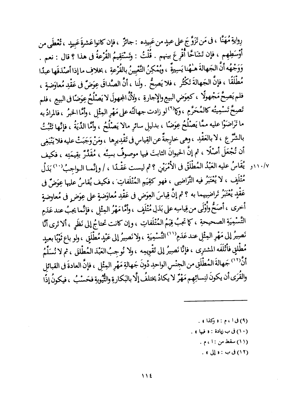 رِوايةِ مُهَنَّا، فى مَن تَزَوَّجَ على عبدٍ من عَبِيدِه: جائزٌ، فإن كانوا عَشرةَ عَبِيدٍ، تُعْطَى من أوْسَطِهِم، فإن تَشَاحَّا أُقْرِعَ بينهم. قُلْتُ: وتَسْتَقِيمُ القُرْعةُ فى هذا؟ قال: نعم. وَوَجْهُه أَنَّ الجَهالةَ ههُنا يَسِيرةٌ، ويُمْكِنُ التَّعْيِينُ بالقُرْعةِ، بخلافِ ما إذا أصْدَقَها عبدًا مُطْلَقًا، فإن الجَهالةَ تَكْثُر، فلا يَصِحُّ. ولَنا، أَنَّ الصَّداقَ عِوَضٌ فى عَقْدِ مُعاوَضةٍ، فلم يَصِحَّ مَجْهولًا، كعِوَضِ البيعِ والإجارةِ، ولأنَّ المجهولَ لا يَصْلُحُ عِوَضًا فى البيعِ، فلم تَصِحَّ تَسْمِيتُه كالمُحَرَّمِ، وكما (٩) لو زادت جهالَتُه على مَهْرِ المِثْلِ، وأمَّا الخبرُ، فالمرادُ به ما تَرَاضَوْا عليه ممَّا يَصْلُحُ عِوَضًا، بدليلِ سائرِ مالا يَصْلُحُ، وأمَّا الدِّيَةُ، فإنَّها تَثْبُتُ بالشرعِ، لا بالعَقْدِ، وهى خارِجةٌ عن القِياسِ فى تَقْدِيرِها، ومَنْ وَجَبَتْ عليه فلا يَنْبَغِى أن تُجْعَلَ أصْلًا، ثم إنَّ الحيوانَ الثابتَ فيها موصوفٌ بسِنِّه، مُقَدَّرٌ بقِيمَتِه، فكيف يُقَاسُ عليه العَبْدُ المُطْلَقُ فى الأمْرَيْنِ؟ ثم ليست عَقْدًا، وإنَّما الواجِبُ (١٠) بَدَلُ مُتْلَفٍ، لا يُعْتَبَرُ فيه التَّرَاضِى، فهو كقِيَمِ المُتْلَفاتِ، فكيف يُقاسُ عليها عِوَضٌ فى عَقْدٍ يُعْتَبَرُ تَراضِيهما به؟ ثم إنَّ قِياسَ العِوَض فى عَقْدِ مُعاوَضةٍ على عِوَضٍ فى مُعاوضةٍ أخرى، أصَحُّ وأوْلَى من قِياسِه على بَدَلِ مُتْلَفٍ، وأمَّا مَهْرُ المِثْلِ، فإنَّما يجبُ عند عَدَمِ التَّسْمِيَةِ الصحيحةِ، كما تجبُ قِيَمُ المُتْلَفاتِ، وإن كانت تحتاجُ إلى نَظَرٍ، ألا تَرى أنَّا نَصِيرُ إلى مَهْرِ المِثْلِ عند عَدَمِ (١١) التَّسْمِيَةِ، ولا نَصِيرُ إلى عَبْدٍ مُطْلَقٍ، ولو باع ثَوْبًا بعبدٍ مُطْلقٍ فأتْلَفَه المشترِى، فإنَّا نَصِيرُ إلى تَقْوِيمِه، ولا نُوجِبُ العَبْدَ المُطْلقَ، ثم لا نُسَلِّمُ أَنَّ (١٢) جَهالةَ المُطْلَقِ من الجِنْسِ الواحدِ دُونَ جَهالةِ مَهْرِ المِثْلِ، فإنَّ العادةَ فى القبائلِ والقُرَى أن يكونَ لنِسائِهِم مَهْرٌ لا يكادُ يختلفُ إلَّا بالبَكارةِ والثُّيُوبةِ فحَسْبُ، فيكونُ إذًا
