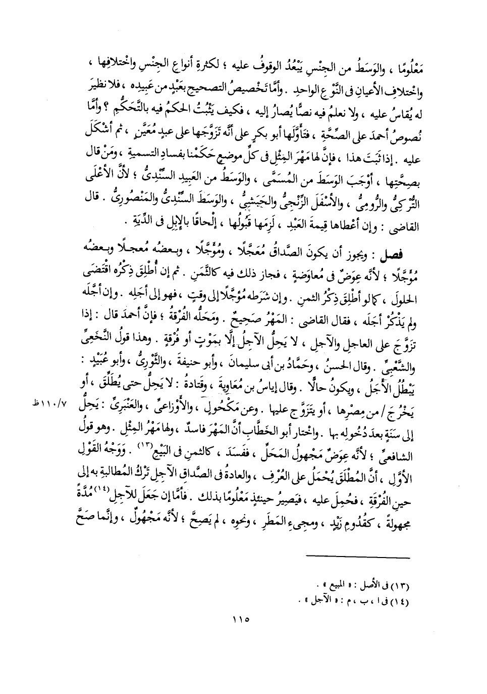 مَعْلُومًا، والوَسَطُ من الجِنْسِ يَبْعُدُ الوقوفُ عليه؛ لكثرةِ أنواعِ الجِنْسِ واخْتلافِها، واخْتلافِ الأعيانِ فى النَّوْعِ الواحدِ. وأمَّا تَخْصيصُ التصحيحِ بعَبْدٍ من عَبِيدِه، فلا نظيرَ له يُقاسُ عليه، ولا نعلمُ فيه نصًّا يُصارُ إليه، فكيف يَثْبُتُ الحكمُ فيه بالتَّحَكُّمِ؟ وأمَّا نُصوصُ أحمدَ على الصِّحَّةِ، فتَأَوَّلَها أبو بكرٍ على أنَّه تَزَوَّجَها على عبدٍ مُعَيَّنٍ، ثم أشْكَلَ عليه. إذا ثَبَتَ هذا، فإنَّ لها مَهْرَ المِثْلِ فى كلِّ موضعٍ حَكَمْنا بفسادِ التسميةِ، ومَنْ قال بصِحَّتِها، أوْجَبَ الوَسَطَ من المُسَمَّى، والوَسَطُ من العَبِيدِ السِّنْدِىُّ؛ لأنَّ الأعْلَى التُّرْكِىُّ والرُّومِىُّ، والأسْفَلَ الزنْجِىُّ والحَبَشِىُّ، والوَسَطَ السِّنْدِىُّ والمَنْصُورِىُّ. قال القاضى: وإن أعْطاها قِيمةَ العَبْدِ، لَزِمَها قَبُولُها، إلْحاقًا بالإِبلِ فى الدِّيَةِ.