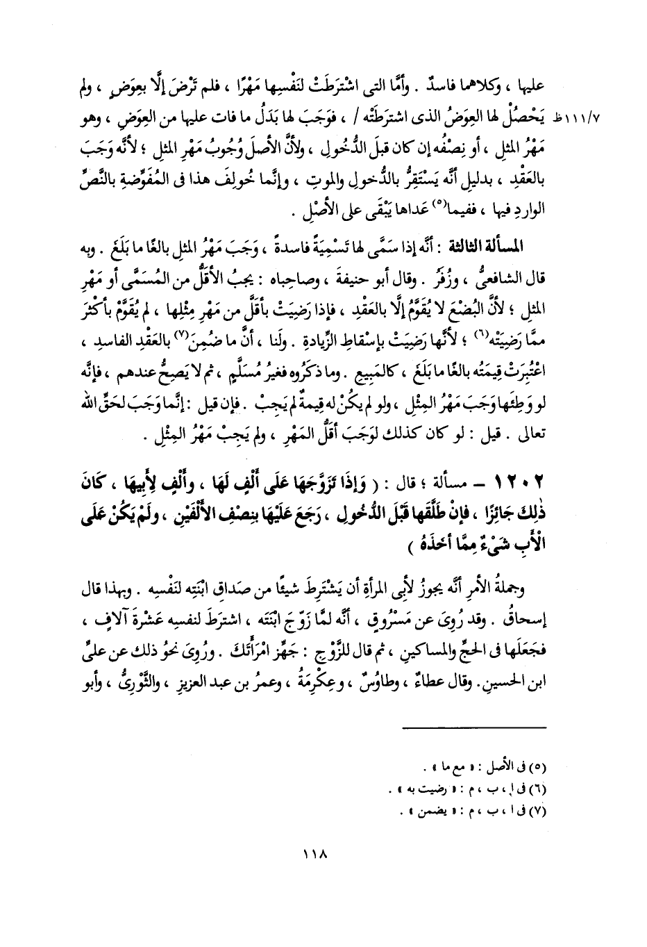 عليها، وكلاهما فاسدٌ. وأمَّا التى اشْترَطَتْ لنَفْسِها مَهْرًا، فلم تَرْضَ إِلَّا بعِوَضٍ، ولم يَحْصُلْ لها العِوَضُ الذى اشترَطَتْه، فوَجَبَ لها بَدَلُ ما فات عليها من العِوَضِ، وهو مَهْرُ المثلِ، أو نِصْفُه إن كان قبلَ الدُّخُولِ، ولأنَّ الأَصلَ وُجُوبُ مَهْرِ المثلِ؛ لأنَّه وَجَبَ بالعَقْدِ، بدليلِ أنَّه يَسْتَقِرُّ بالدُّخولِ والموتِ، وإنَّما خُولِفَ هذا فى المُفَوِّضةِ بالنَّصِّ الواردِ فيها، ففيما (٥) عَداها يَبْقَى على الأَصْلِ.