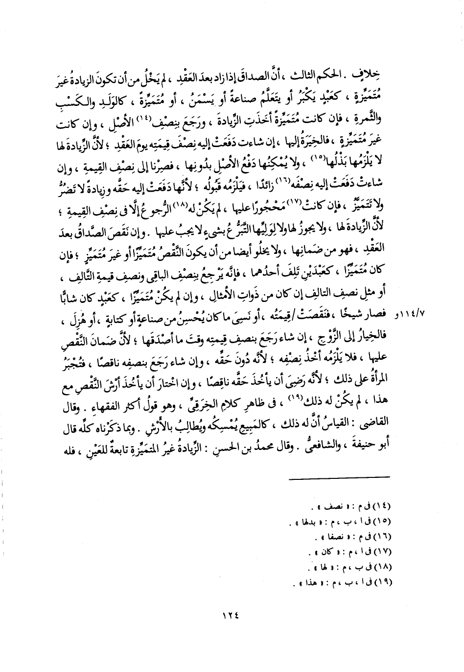 خِلافٍ. الحكم الثالث، أنَّ الصداقَ إذا زاد بعدَ العَقْدِ، لم يَخْلُ من أن تكونَ الزيادةُ غيرَ مُتَمَيزةٍ، كعَبْدٍ يَكْبَرُ أو يتَعَلَّمُ صناعةً أو يَسْمَنُ، أو مُتَمَيِّزةً، كالوَلَدِ والكَسْبِ والثَّمرةِ، فإن كانت مُتَمَيِّزةً أخَذَتِ الزيادةَ، ورَجَعَ بنِصْفِ (١٤) الأصْلِ، وإن كانت غيرَ مُتَمَيِّزةٍ، فالخِيَرَةُ إليها، إن شاءت دَفَعَتْ إليه نِصْفَ قِيمَتِه يومَ العَقْدِ؛ لأنَّ الزيادةَ لها لا يَلْزَمُها بَذْلُها (١٥)، ولا يُمْكِنُها دَفْعُ الأصْلِ بدُونِها، فصِرْنا إلى نِصْفِ القِيمةِ، وإن شاءتْ دَفَعَتْ إليه نِصْفَه (١٦) زائدًا، فيَلْزَمُه قبولُه؛ لأنَّها دَفَعَتْ إليه حَقَّه وزيادةً لا تَضُرُّ ولا تَتَمَيَّز، فإن كانتْ (١٧) مَحْجُورًا عليها، لم يَكُنْ له (١٨) الرُّجوعُ إلّا فى نِصْفِ القِيمةِ؛ لأنَّ الزِّيادةَ لها، ولايجوزُ لها ولا لِوَلِيِّها التَّبَرُّعُ بشىءٍ لايجبُ عليها. وإن نَقَصَ الصَّداقُ بعدَ العَقْدِ، فهو من ضَمانِها، ولا يخلُو أيضًا من أن يكونَ النَّقْصُ مُتَمَيِّزًا أو غيرَ مُتَمَيِّزٍ؛ فإن كان مُتَمَيِّزًا، كعَبْدَيْنِ تَلِفَ أحدُهما، فإنَّه يَرْجِعُ بنِصْفِ الباقِى ونصفِ قيمةِ التَّالفِ، أو مثلِ نصفِ التالفِ إن كان من ذَواتِ الأمثالِ، وإن لم يكُنْ مُتَمَيِّزًا، كعَبْدٍ كان شابًّا فصار شيخًا، فنَقَصَتْ قِيمَتُه، أو نَسِىَ ما كان يُحْسِنُ من صناعةٍ أو كتابةٍ، أو هُزِلَ، فالخِيارُ إلى الزَّوْجِ، إن شاء رَجَعَ بنصفِ قِيمتِه وقتَ ما أصْدَقَها؛ لأنَّ ضَمانَ النَّقْصِ عليها، فلا يَلْزَمُه أخْذُ نِصْفِه؛ لأنَّه دُونَ حَقِّه، وإن شاء رَجَعَ بنصفِه ناقصًا، فتُجْبَرُ المرأةُ على ذلك؛ لأنَّه رَضِىَ أن يأخُذَ حَقَّه ناقِصًا، وإن اخْتارَ أن يأخُذَ أرْشَ النَّقْصِ مع هذا، لم يكُنْ له ذلك (١٩)، فى ظاهرِ كلامِ الخِرَقِىِّ، وهو قولُ أكثر الفقهاءِ. وقال القاضى: القياسُ أَنَّ له ذلك، كالمَبِيعِ يُمْسِكُه ويُطالِبُ بالأرْشِ. وبما ذكَرْناه كلِّه قال أبو حنيفةَ، والشافعىُّ. وقال محمدُ بن الحسنِ: الزِّيادةُ غيرُ المتمَيِّزةِ تابعةٌ للعَيْنِ، فله