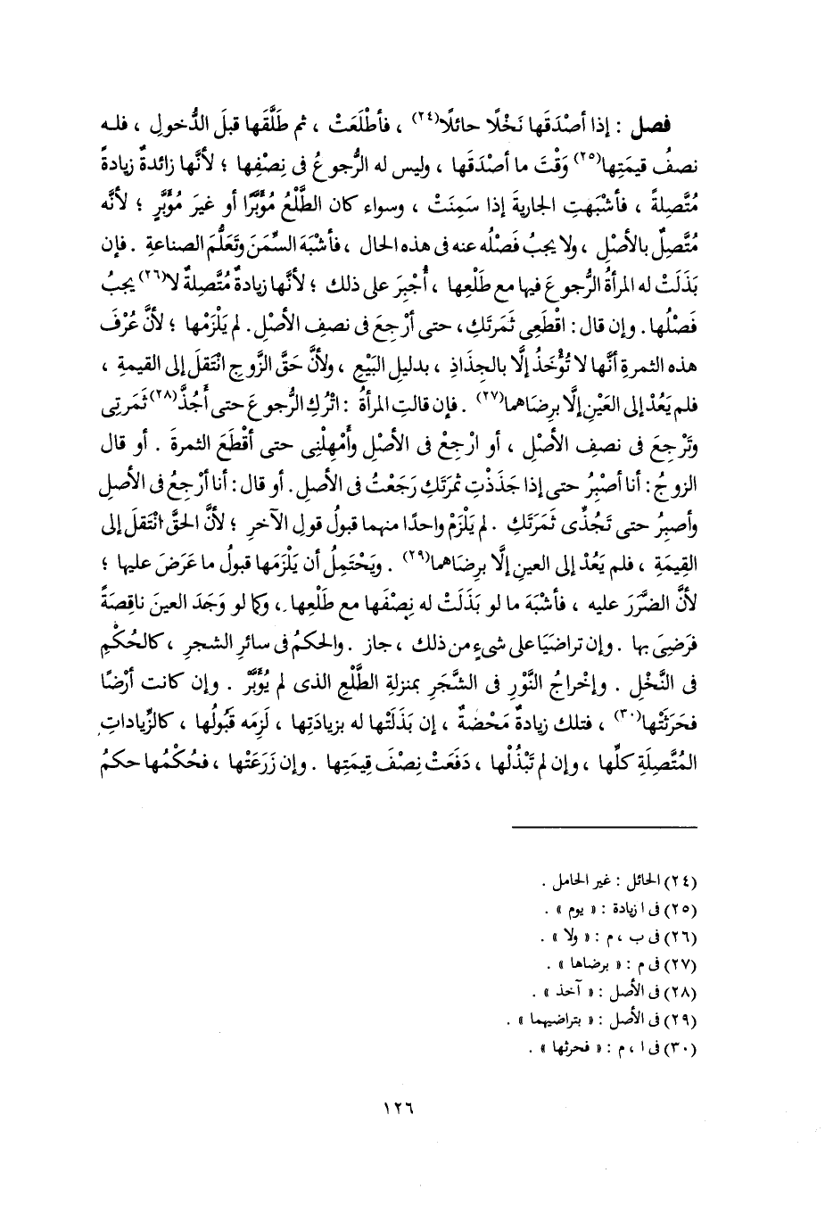 فصل: إذا أصْدَقَها نَخْلًا حائلًا (٢٤)، فأطْلَعَتْ، ثم طَلَّقَها قبلَ الدُّخولِ، فله نصفُ قيمَتِها (٢٥) وَقْتَ ما أصْدَقَها، وليس له الرُّجوعُ فى نِصْفِها؛ لأنَّها زائدةٌ زيادةً مُتَّصِلةً، فأشْبَهتِ الجاريةَ إذا سَمِنَتْ، وسواء كان الطَّلْعُ مُؤَبَّرًا أو غيرَ مُؤَبَّرٍ؛ لأنَّه مُتَّصِلٌ بالأَصْلِ، ولا يجبُ فَصْلُه عنه فى هذه الحال، فأشْبَهَ السِّمَنَ وتَعَلُّمَ الصناعةِ. فإن بَذَلَتْ له المرأةُ الرُّجوعَ فيها مع طَلْعِها، أُجْبِرَ على ذلك؛ لأنَّها زيادةٌ مُتَّصِلةٌ لا (٢٦) يجبُ فَصْلُها. وإن قال: اقْطَعِى ثَمَرتَكِ، حتى أرْجِعَ فى نصفِ الأصْلِ. لم يَلْزَمْها؛ لأنَّ عُرْفَ هذه الثمرةِ أنَّها لا تُؤْخَذُ إلا بالجِذَاذِ، بدليلِ البَيْعِ، ولأنَّ حَقَّ الزَّوجِ انْتَقلَ إلى القيمةِ، فلم يَعُدْ إلى العَيْنِ إلَّا برِضَاهما (٢٧). فإن قالتِ المرأةُ: اتْرُكِ الرُّجوعَ حتى أَجُذَّ (٢٨) ثَمَرتِى وتَرْجِعَ فى نصفِ الأَصْلِ، أو ارْجِعْ فى الأَصْلِ وأَمهِلْنِى حتى أقْطَعَ الثمرةَ. أو قال الزوجُ: أنا أصْبِرُ حتى إذا جَذَذْتِ ثمرَتَكِ رَجَعْتُ فى الأصلِ. أو قال: أنا أرْجِعُ فى الأصلِ وأصبِرُ حتى تَجُذِّى ثَمَرَتَكِ. لم يَلْزَمْ واحدًا منهما قبولُ قولِ الآخرِ؛ لأنَّ الحقَّ انْتَقلَ إلى القِيمَةِ، فلم يَعُدْ إلى العينِ إلَّا برِضَاهما (٢٩). ويَحْتَمِلُ أن يَلْزَمَها قبولُ ما عَرَضَ عليها؛ لأنَّ الضَّرَرَ عليه، فأشْبَهَ ما لو بَذَلَتْ له نِصْفَها مع طَلْعِها، وكما لو وَجَدَ العينَ ناقِصَةً فرَضِىَ بها. وإن تراضَيَا على شىءٍ من ذلك، جاز. والحكمُ فى سائرِ الشجرِ، كالحُكْمِ فى النَّخْلِ. وإخْراجُ النَّوْرِ فى الشَّجَرِ بمنزلةِ الطَّلْعِ الذى لم يُؤَبَّرْ. وإن كانت أرْضًا فحَرَثَتْها (٣٠)، فتلك زيادةٌ مَحْضةٌ، إن بَذَلَتْها له بزيادَتِها، لَزِمَه قبولُها، كالزِّياداتِ المُتَّصِلَةِ كلِّها، وإن لم تَبْذُلْها، دَفَعَتْ نِصْفَ قِيمَتِها. وإن زَرَعَتْها، فحُكْمُها حكمُ