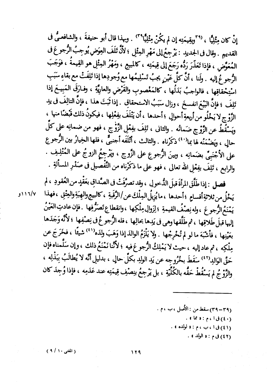 فصل: إذا طَلَّقَ المرأةَ قبلَ الدُّخولِ، وقد تصرَّفَتْ فى الصَّداقِ بعَقْد من العُقودِ، لم يَخْلُ من ثلاثةِ أقسامٍ؛ أحدها، ما يُزِيلُ المِلْكَ عن الرَّقبةِ، كالبيعِ والهِبَةِ والعِتْقِ، فهذا يَمْنَعُ الرُّجوعَ، وله نِصْفُ القيمةِ؛ لِزَوال مِلْكِها، وانقطاعِ تصَرُّفِها. فإن عادتِ العَيْنُ إليها قبلَ طَلاقِها، ثم طَلَّقها وهى فى يَدِها بحالِها، فله الرُّجوعُ فى نِصْفِها؛ لأنَّه وَجَدَها بعَيْنِها، فأشْبَهَ ما لو لم تُخْرِجْها. ولا يَلْزَمُ الوالدَ إذا وَهَبَ ولدَه (٤١) شيئًا، فخَرَجَ عن مِلْكِه، ثم عاد إليه، حيث لا يَمْلِكُ الرُّجوعَ فيه؛ لأنَّنا نَمْنَعُ ذلك، وإن سَلَّمناه فإن حَقَّ الوَالدِ (٤٢) سَقَطَ بخُرُوجه عن يد الولدِ بكلِّ حالٍ، بدليلِ أنَّه لا يُطالَبُ بِبَذْلِه، والزَّوْجُ لم يَسْقُطْ حَقُّه بالكُلِّيّةِ، بل يَرْجِعُ لنصْفِ قِيمَتِه عند عَدَمِه، فإذا وُجِدَ كان