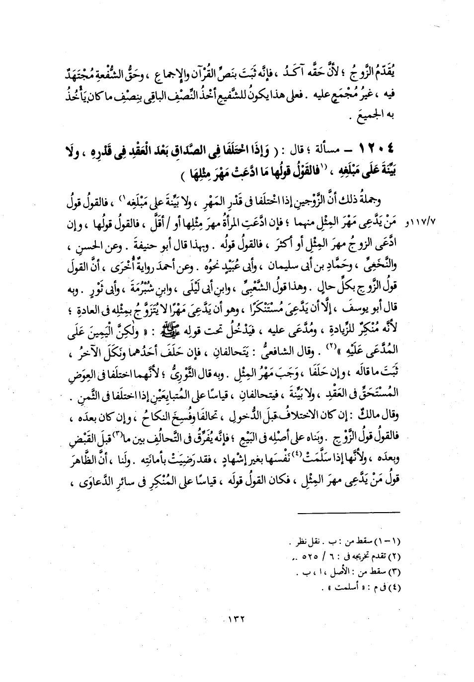 وجملةُ ذلك أَنَّ الزَّوْجينِ إذا اخْتلَفا فى قَدْرِ المَهْرِ، ولا بَيِّنةَ على مَبْلَغِه] (١)، فالقولُ قولُ مَنْ يَدَّعِى مَهْرَ المِثْلِ منهما، فإن ادَّعَتِ المرأةُ مهرَ مِثْلِها أو أقَلَّ، فالقولُ قولُها، وإن ادَّعَى الزوجُ مهرَ المِثْلِ أو أكثرَ، فالقولُ قولُه. وبهذا قال أبو حنيفةَ. وعن الحسنِ، والنَّخَعِىِّ، وحَمَّادِ بن أبى سليمان، وأبى عُبَيْدٍ نحوُه. وعن أحمدَ روايةٌ أُخْرَى، أَنَّ القولَ قولُ الزَّوجِ بكلِّ حالٍ. وهذا قولُ الشَّعْبِىِّ، وابنِ أبى لَيْلَى، وابنِ شُبْرُمَةَ، وأبى ثَوْرٍ. وبه قال أبو يوسفَ، إلَّا أن يَدَّعِىَ مُسْتَنْكَرًا، وهو أن يَدَّعِىَ مَهْرًا لا يُتَزَوَّجُ بمِثْلِه فى العادةِ؛ لأنَّه مُنْكِرٌ للزِّيادةِ، ومُدَّعَى عليه، فيَدْخُلُ تحت قولِه -صلى اللَّه عليه وسلم-: "ولكِنَّ الْيَمِينَ عَلَى المُدَّعَى عَلَيْهِ" (٢). وقال الشافعىُّ: يَتَحالفانِ، فإن حَلَفَ أحَدُهما ونَكَلَ الآخرُ، ثَبَتَ ما قالَه، وإن حَلَفَا، وَجَبَ مَهْرُ المِثْلِ. وبه قال الثَّوْرِىُّ؛ لأنَّهما اختلَفا فى العِوَضِ المُسْتَحَقِّ فى العَقْدِ، ولا بَيِّنةَ، فيتحالفانِ، قياسًا على المُتبايِعَيْنِ إذا اختلَفا فى الثَّمنِ. وقال مالكٌ: إن كان الاختلافُ قبلَ الدُّخولِ، تحالفَا وفُسِخَ النِّكاحُ، وإن كان بعدَه، فالقولُ قولُ الزَّوْجِ. وبَناه على أصْلِه فى البَيْعِ؛ فإنَّه يُفَرِّق فى التَّحالُفِ بين ما (٣) قبلَ القَبْضِ وبعدَه، ولأنَّها إذا سَلَّمَتْ (٤) نَفْسَها بغير إشْهادٍ، فقد رَضِيَتْ بأمانَتِه. ولَنا، أَنَّ الظَّاهرَ قولُ مَنْ يَدَّعِى مهرَ المِثْلِ، فكان القولُ قولَه، قياسًا على المُنْكِرِ فى سائرِ الدَّعاوَى،