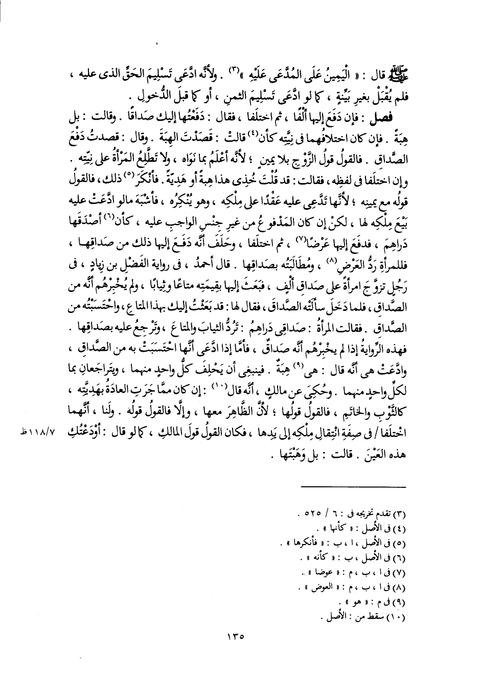 فصل: فإن دَفَعَ إليها ألْفًا، ثم اختلَفا، فقال: دَفَعْتُها إليك صَداقًا. وقالت: بل هِبَةً. فإن كان اختلافُهما فى نِيَّتِه كأن (٤) قالتْ: قَصَدْتَ الهِبَةَ. وقال: قصدتُ دَفْعَ الصَّداقِ. فالقولُ قولُ الزَّوْجِ بلا يمينٍ؛ لأنَّه أعْلَمُ بما نَوَاه، ولا تَطَّلِعُ المَرْأةُ على نِيّتِه. وإن اختلَفا فى لفظِه، فقالت: قد قُلْتَ خُذِى هذا هِبةً أو هَدِيّةً. فأنْكَرَ (٥) ذلك، فالقولُ قولُه مع يمينِه؛ لأنَّها تَدَّعِى عليه عَقْدًا على مِلْكِه، وهو يُنْكِرُه، فأشْبَهَ ما لو ادَّعَتْ عليه بَيْعَ مِلْكِه لها، لكنْ إن كان المَدْفوعُ من غيرِ جِنْسِ الواجبِ عليه، كأن (٦) أصْدَقَها دَراهِمَ، فدفَعَ إليها عَرْضًا (٧)، ثم اختلَفا، وحَلَفَ أنَّه دَفَعَ إليها ذلك من صَداقِها، فللمرأةِ رَدُّ العَرْضِ (٨)، ومُطَالَبَتُه بصَداقِها. قال أحمدُ، فى رواية الفَضْلِ بن زِيادٍ، فى رَجُلٍ تزوَّجَ امرأةً على صَداقِ ألْفٍ، فبَعَثَ إليها بقِيمَتِه متاعًا وثِيابًا، ولم يُخْبِرْهُم أنَّه من الصَّداقِ، فلما دَخَلَ سألتْه الصَّداقَ، فقال لها: قد بَعَثْتُ إليك بهذا المتاعِ، واحْتَسَبْتُه من الصَّداقِ. فقالت المرأةُ: صَداقِى دَراهِمُ: تَرُدُّ الثيابَ والمتاعَ، وتَرْجِعُ عليه بصَداقِها. فهذه الرِّوايةُ إذا لم يخْبِرْهُم أَنَّه صَداقٌ، فأمَّا إذا ادَّعَى أنَّها احْتَسَبَتْ به من الصَّداقِ، وادَّعَتْ هى أنَّه قال: هى (٩) هِبَةٌ. فينبغِى أن يَحْلِفَ كل واحدٍ منهما، ويتَراجَعانِ بما لكلِّ واحدٍ منهما. وحُكِىَ عن مالكٍ، أنَّه قال (١٠): إن كان ممَّا جَرَتِ العادَةُ بهَدِيَّتِه، كالثَّوْبِ والخاتَمِ، فالقولُ قولُها؛ لأنَّ الظَّاهِرَ معها، وإلَّا فالقولُ قولُه. ولَنا، أنَّهما اخْتلَفا فى صِفَةِ انْتِقالِ مِلْكِه إلى يدِها، فكان القولُ قولَ المالكِ، كما لو قال: أوْدَعْتُكِ هذه العَيْنَ. قالت: بل وَهَبْتَها.