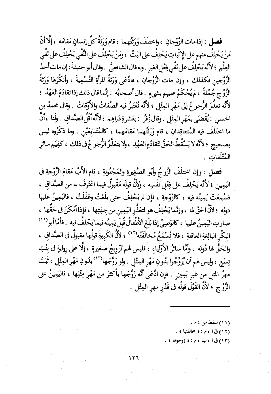 فصل: إذا مات الزَّوْجانِ، واختلَفَ وَرَثَتُهما، قام وَرَثَةُ كلِّ إنسانٍ مَقامَه، إلَّا أنّ مَنْ يَحْلِفُ منهم على الإِثْباتِ يَحْلِفُ على البَتِّ، ومَنْ يَحْلِفُ على النَّفْى يَحْلِفُ على نَفْى العِلْمِ؛ لأنَّه يَحْلِفُ على نَفْى فِعْلِ الغيرِ. وبه قال الشافعىُّ. وقال أبو حنيفةَ: إن مات أحدُ الزَّوْجينِ فكذلك، وإن مات الزَّوْجانِ، فادَّعَى وَرَثةُ المرأةِ التَّسْمِيةَ، وأنكْرَهَا وَرَثةُ الزَّوْجِ جُمْلةً، لم يُحْكَمْ عليهم بشىءٍ. قال أصحابُه: إنَّما قال ذلك إذا تقادَمَ العَهْدُ؛ لأنَّه تعذَّرَ الرُّجوعُ إلى مَهْرِ المِثْلِ؛ لأنَّه تُعْتَبرُ فيه الصِّفاتُ والأوْقاتُ. وقال محمدُ بن الحسنِ: يُقْضَى بمَهْرِ المِثْلِ. وقال زُفَرُ: بعَشرةِ دَراهِم؛ لأنَّه أقَلُّ الصَّداقِ. ولَنا، أَنَّ ما اختَلَفَ فيه المُتعاقِدانِ، قام وَرَثتهما مَقامَهما، كالمُتَبايِعَيْنِ. وما ذكَرُوه ليس بصحيحٍ؛ لأنَّه لا يَسْقُطُ الحَقُّ لتَقادُمِ العَهْدِ، ولا يتعَذَّرُ الرُّجوعُ فى ذلك، كقِيَمِ سائرِ المُتْلَفاتِ.