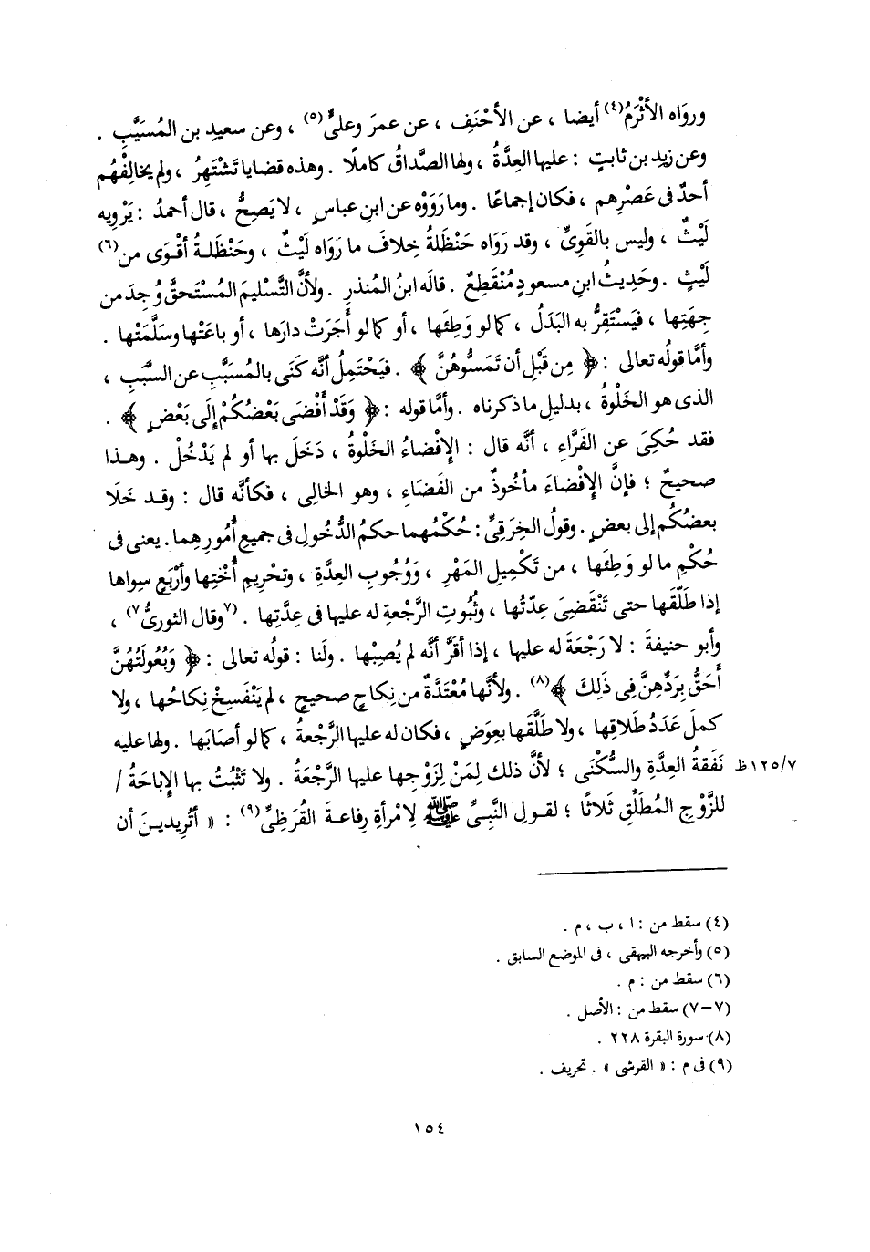 وروَاه الأَثْرَمُ (٤) أيضًا، عن الأحْنَفِ، عن عمرَ وعلىٍّ (٥)، وعن سعيد بن المُسَيَّبِ. وعن زَيدِ بن ثابتٍ: عليها العِدَّةُ، ولها الصَّداقُ كاملًا. وهذه قضايا تَشْتَهِرُ، ولم يخالِفْهُم أحدٌ فى عَصْرِهم، فكان إجماعًا. وما رَوَوْه عن ابنِ عباسٍ، لا يَصِحُّ، قال أحمدُ: يَرْوِيه لَيْثٌ، وليس بالقَوِىِّ، وقد رَوَاه حَنْظَلةُ خِلافَ ما روَاه لَيْثٌ، وحَنْظَلةُ أقْوَى من (٦) لَيْثٍ. وحَدِيثُ ابنِ مسعودٍ مُنْقَطِعٌ. قالَه ابنُ المُنذرِ. ولأنَّ التَّسْليمَ المُسْتَحقَّ وُجِدَ من جهَتِها، فيَسْتَقِرُّ به البَدَلُ، كما لو وَطِئَها، أو كما لو أَجَرَتْ دارَها، أو باعَتْها وسَلَّمَتْها. وَأمَّا قولُه تعالى: {مِنْ قَبْلِ أَنْ تَمَسُّوهُنَّ}. فيَحْتَمِلُ أنَّه كَنَى بالمُسَبَّبِ عن السبَّبَ، الذى هو الخَلْوةُ، بدليلِ ما ذكرناه. وأمَّا قوله: {وَقَدْ أَفْضَى بَعْضُكُمْ إِلَى بَعْضٍ}. فقد حُكِىَ عن الفَرَّاءِ، أنَّه قال: الإفْضاءُ الخَلْوةُ، دَخَلَ بها أو لم يَدْخُلْ. وهذا صحيحٌ؛ فإنَّ الإفْضاءَ مَأخُوذٌ من الفَضَاءِ، وهو الخالِى، فكأنَّه قال: وقد خَلَا بعضُكُم إلى بعضٍ. وقولُ الخِرَقِىِّ: حُكْمُهما حكمُ الدُّخُولِ فى جميعِ أُمُورِهِما. يعنى فى حُكْمِ ما لو وَطِئَها، من تَكْمِيلِ المَهْرِ، وَوُجُوبِ العِدَّةِ، وتَحْرِيمِ أُخْتِها وأربَعٍ سِواها إذا طَلَّقَها حتى تَنْقَضِىَ عِدَّتُها، وثُبُوتِ الرجْعةِ له عليها فى عِدَّتِها. [وقال الثورىُّ] (٧)، وأبو حنيفةَ: لا رَجْعَةَ له عليها، إذا أقَرَّ أنَّه لم يُصِبْها. ولَنا: قولُه تعالى: {وَبُعُولَتُهُنَّ أَحَقُّ بِرَدِّهِنَّ فِى ذَلِكَ} (٨). ولأنَّها مُعْتَدَّة من نِكاحٍ صحيحٍ، لم يَنْفَسِخْ نِكاحُها، ولا كملَ عَدَدُ طَلاقِها، ولا طَلَّقَها بعِوَضٍ، فكان له عليها الرَّجْعةُ، كما لو أصَابَها. ولها عليه نَفَقةُ العِدَّةِ والسُّكْنَى؛ لأنَّ ذلك لِمَنْ لِزَوْجِها عليها الرجْعَةُ. ولا تَثْبُتُ بها الإِباحَةُ للزَّوْجِ المُطَلِّقِ ثَلاثًا؛ لقولِ النَّبِىِّ -صلى اللَّه عليه وسلم- لِامْرأةِ رِفاعةَ القُرَظِىِّ (٩): "أتُرِيدينَ أن