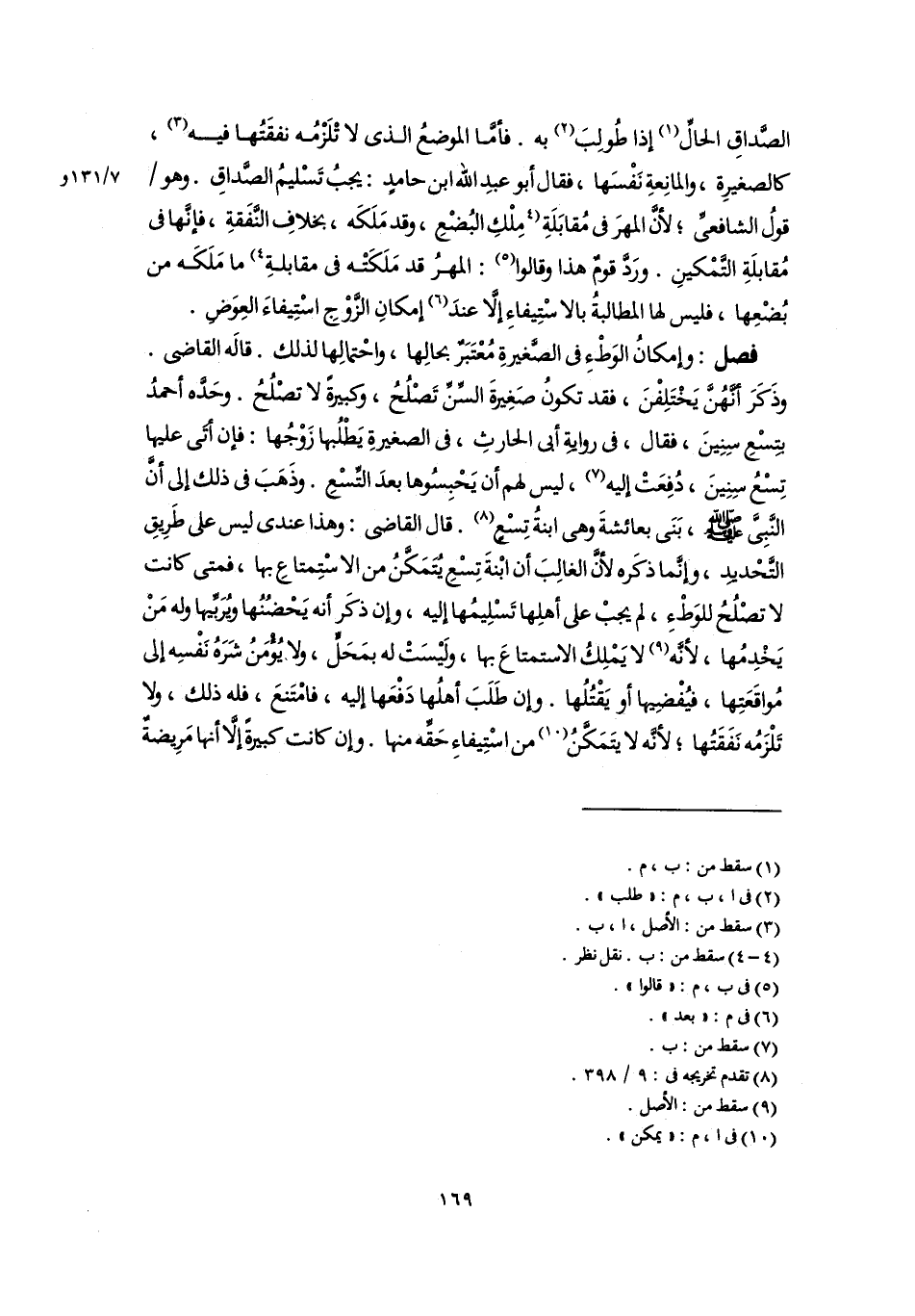 فصل: وإمكانُ الوَطْءِ فى الصَّغيرةِ مُعْتَبَرٌ بحالِها، واحْتمالِها لذلك. قالَه القاضى. وذَكَرَ أنَّهُنَّ يَخْتَلِفْنَ، فقد تكونُ صَغِيرةَ السِّنِّ تَصْلُحُ، وكبيرةً لا تصْلُحُ. وحَدَّه أحمدُ بتِسْعِ سِنِينَ، فقال، فى روايةِ أبى الحارثِ، فى الصغيرةِ يَطْلُبها زَوْجُها: فإن أَتَى عليها تِسْعُ سِنِينَ، دُفِعَتْ إليه (٧)، ليس لهم أن يَحْبِسُوها بعدَ التِّسْعِ. وذَهَبَ فى ذلك إلى أَنَّ النَّبِىَّ -صلى اللَّه عليه وسلم-، بَنَى بعائشةَ وهى ابنةُ تِسْعٍ (٨). قال القاضى: وهذا عندى ليس على طَرِيقِ التَّحْديد، وإنَّما ذكَره لأنَّ الغالِبَ أن ابْنةَ تِسْعِ يُتَمَكَّنُ من الاسْتِمتاعِ بها، فمتى كانت لا تصْلُحُ للوَطْءِ، لم يجبْ على أهلِها تَسْلِيمُها إليه، وإن ذكَر أنَّه يَحْضُنُها ويُرَبِّيها وله مَنْ يَخْدِمُها؛ لأنَّه (٩) لا يَمْلِكُ الاستمتاعَ بها، ولَيْسَتْ له بمَحَلٍّ، ولا يُؤْمَنُ شَرَهُ نَفْسِه إلى مُواقَعَتِها، فيُفْضِيها أو يَقْتُلُها. وإن طَلَبَ أهلُها دَفْعَها إليه، فامْتَنعَ، فله ذلك، ولا تَلْزَمُه نَفَقَتُها؛ لأنَّه لا يتَمَكَّنُ (١٠) من اسْتِيفاءِ حَقِّه منها. وإن كانت كبيرةً إلَّا أنها مَرِيضةٌ