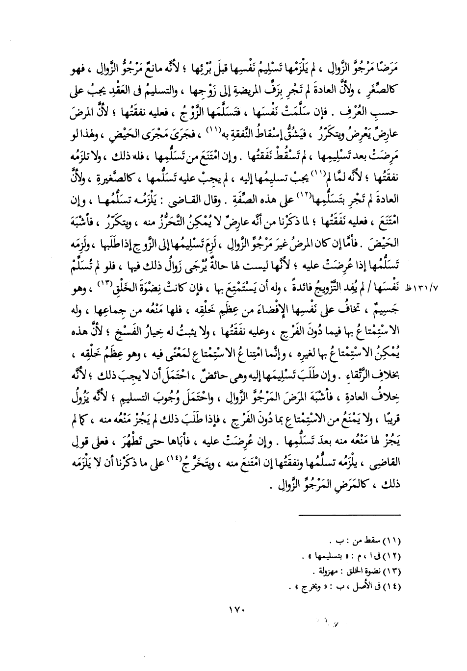 مَرَضًا مَرْجُوَّ الزَّوالِ، لم يَلْزَمْها تَسْلِيمُ نَفْسِها قبلَ بُرْئِها؛ لأنَّه مانعٌ مَرْجُوُّ الزَّوالِ، فهو كالصِّغَرِ، ولأنَّ العادةَ لم تَجْرِ بِزَفِّ المريضةِ إلى زَوْجِها، والتسليمُ فى العَقْدِ يجبُ على حسبِ العُرْفِ. فإن سَلَّمَتْ نَفْسَها، فتَسَلَّمَها الزَّوْجُ، فعليه نفقَتُها؛ لأنَّ المرضَ عارِضٌ يَعْرِضُ ويتكَرّرُ، فيَشُقُّ إسْقاطُ النَّفقةِ به (١١)، فجَرَىَ مَجْرَى الحَيْضِ، ولهذا لو مَرِضَتْ بعد تَسْلِيمِها، لم تَسْقُطْ نَفَقتُها. وإن امْتَنَعَ من تَسَلُّمِها، فله ذلك، ولا تلزَمُه نفقَتُها؛ لأنَّه لمَّا لم (١١) يجبْ تسليمُها إليه، لم يجِبْ عليه تَسَلُّمها، كالصَّغيرةِ، ولأنَّ العادةَ لم تَجْرِ بتَسَلُّمِها (١٢) على هذه الصِّفَةِ. وقال القاضى: يَلْزَمُه تسَلُّمُها، وإن امْتَنَعَ، فعليه نَفَقَتُها؛ لما ذكَرْنا من أنَّه عارِضٌ لا يُمْكِنُ التَّحَرُّزُ منه، ويتكَرّرُ، فأشْبَهَ الحَيْضَ. فأمَّا إن كان المرضُ غيرَ مَرْجُوِّ الزَّوالِ، لَزِمَ تَسْلِيمُها إلى الزوجِ إذا طَلَبها، ولَزِمَه تَسَلُّمُها إذا عُرِضَتْ عليه؛ لأنَّها ليست لها حالةٌ يُرْجَى زَوالُ ذلك فيها، فلو لم تُسَلِّمْ نَفْسَها لم يُفِد التَّزويجُ فائدةً، وله أن يَسْتَمْتِعَ بها، فإن كانتْ نِضْوَةَ الخَلْقِ (١٣)، وهو جَسِيمٌ، تخافُ على نَفْسِها الإفْضاءَ من عِظَمِ خَلْقِه، فلها مَنْعُه من جِماعِها، وله الاسْتِمْتاعُ بها فيما دُونَ الفَرْجِ، وعليه نفَقَتُها، ولا يثبتُ له خِيارُ الفَسْخِ؛ لأنَّ هذه يُمْكِنُ الاسْتِمْتاعُ بها لغيرِه، وإنَّما امْتِناعُ الاسْتِمْتاعِ لمَعْنًى فيه، وهو عِظَمُ خَلْقِه، بخلافِ الرَّتْقاءِ. وإن طَلَبَ تَسْلِيمَها إليه وهى حائضٌ، احْتَمَلَ أن لا يجِبَ ذلك؛ لأنَّه خِلافُ العادةِ، فأشْبَهَ المرَضَ المَرْجُوَّ الزَّوالِ، واحْتَمَلَ وُجُوبَ التسليمِ؛ لأنَّه يَزُولُ قريبًا، ولا يَمْنَعُ من الاسْتِمْتاعِ بما دُونَ الفَرْجِ، فإذا طَلَبَ ذلك لم يَجُزْ مَنْعُه منه، كما لم يَجُزْ لها مَنْعُه منه بعدَ تَسَلُّمِها. وإن عُرِضَتْ عليه، فأبَاها حتى تَطْهُرَ، فعلى قولِ القاضِى، يلْزَمُه تسلُّمُها ونفقَتُها إن امْتَنعَ منه، ويتَخَرَّجُ (١٤) على ما ذكَرْنا أن لا يَلْزَمَه ذلك، كالمَرَض المَرْجُوِّ الزوالِ.