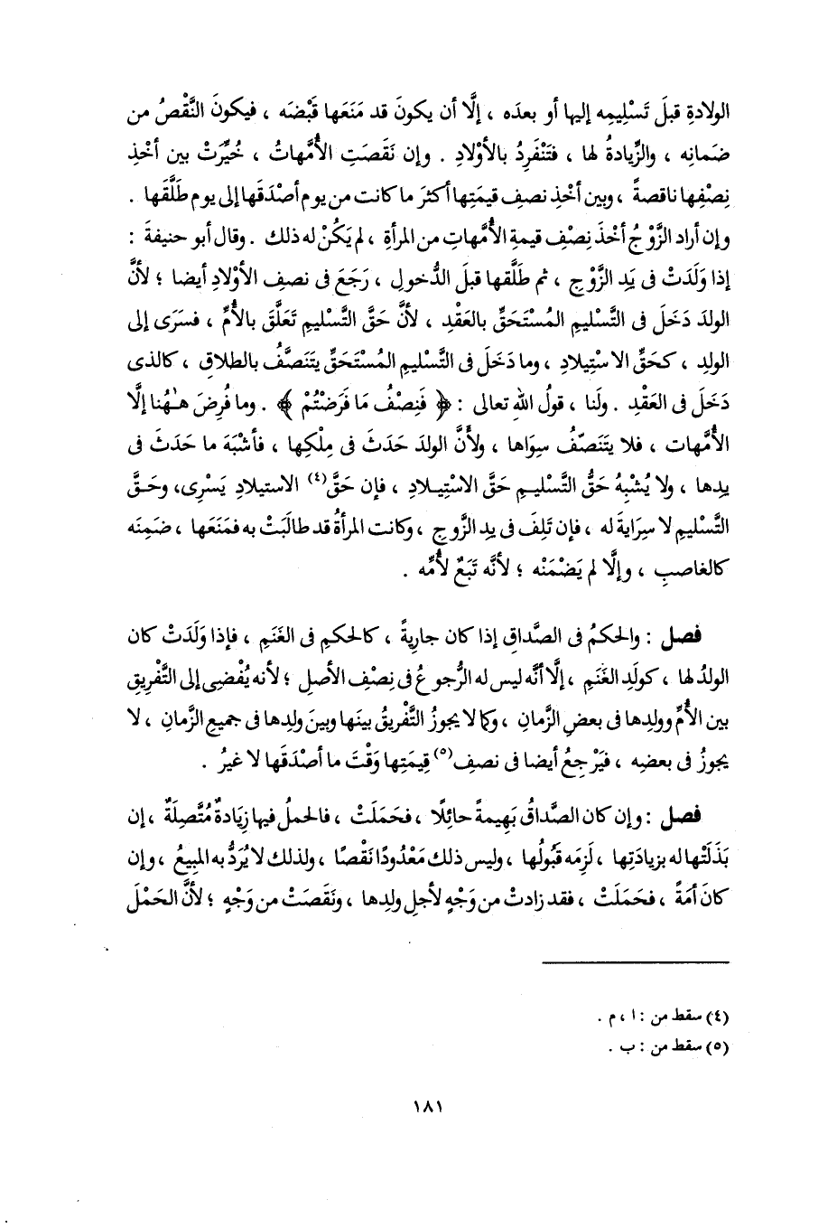 فصل: والحكمُ فى الصَّداقِ إذا كان جارِيةً، كالحكمِ فى الغَنَمِ، فإذا وَلَدَتْ كان الولدُ لها، كوَلدِ الغنَمِ، إلَّا أنَّه ليس له الرجوعُ فى نِصْفِ الأصلِ؛ لأنَّه يُفْضِى إلى التَّفْرِيقِ بين الأُمِّ وولدِها فى بعض الزَّمانِ، وكما لا يجوزُ التَّفْريقُ بينَها وبينَ ولدِها فى جميعِ الزَّمانِ، لا يجوزُ فى بعضِه، فيَرْجِعُ أيضًا فى نصفِ (٥) قِيمَتِها وَقْتَ ما أصْدَقَها لا غيرُ.