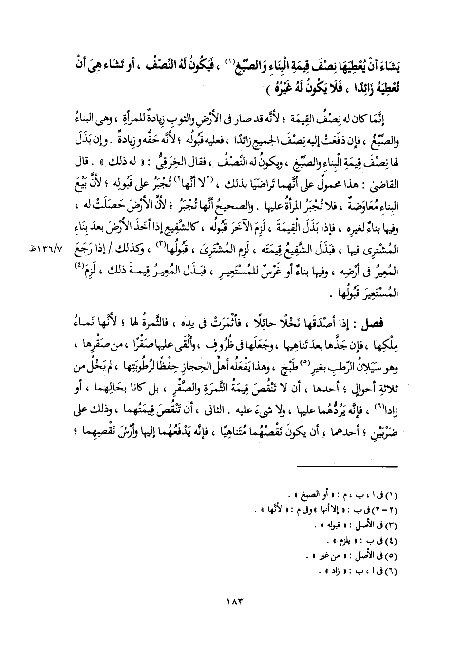 يَشَاءَ أَنْ يُعْطِيَهَا نِصْفَ قِيمَةِ الْبِنَاءِ وَالصِّبْغِ (١)، فَيَكُونُ لَهُ النِّصْفُ، أو تَشَاء هِىَ أَنْ تُعْطِيَهُ زائِدًا، فَلَا يَكُونُ لَهُ غَيْرُهُ)