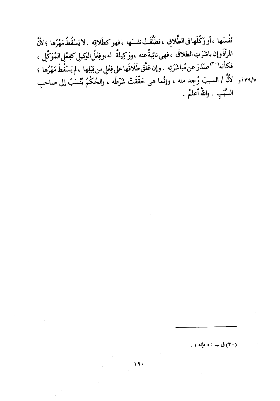 نَفْسَها، أو وَكّلَها فى الطَّلاقِ، فطَلَّقَتْ نفسَها، فهو كطَلاقِه. لا يَسْقُطُ مَهْرُها؛ لأنَّ المرأةَ وإِن باشَرَتِ الطَّلاقَ، فهى نائِبةٌ عنه، ووَكِيلةٌ له، وفِعْلُ الوكيلِ كفِعْلِ المُوَكِّل، فكأنه (٣٠) صَدَرَ عن مُباشَرَتِه. وإن عَلَّقَ طَلَاقَها على فِعْلٍ من قِبَلِها، لم يَسْقُطْ مَهْرُها؛ لأنَّ السببَ وُجِد منه، وإنَّما هى حَقّقَتْ شَرْطَه، والحُكْمُ يُنْسَبُ إلى صاحبِ السَّبَبِ. واللَّهُ أعلمُ.