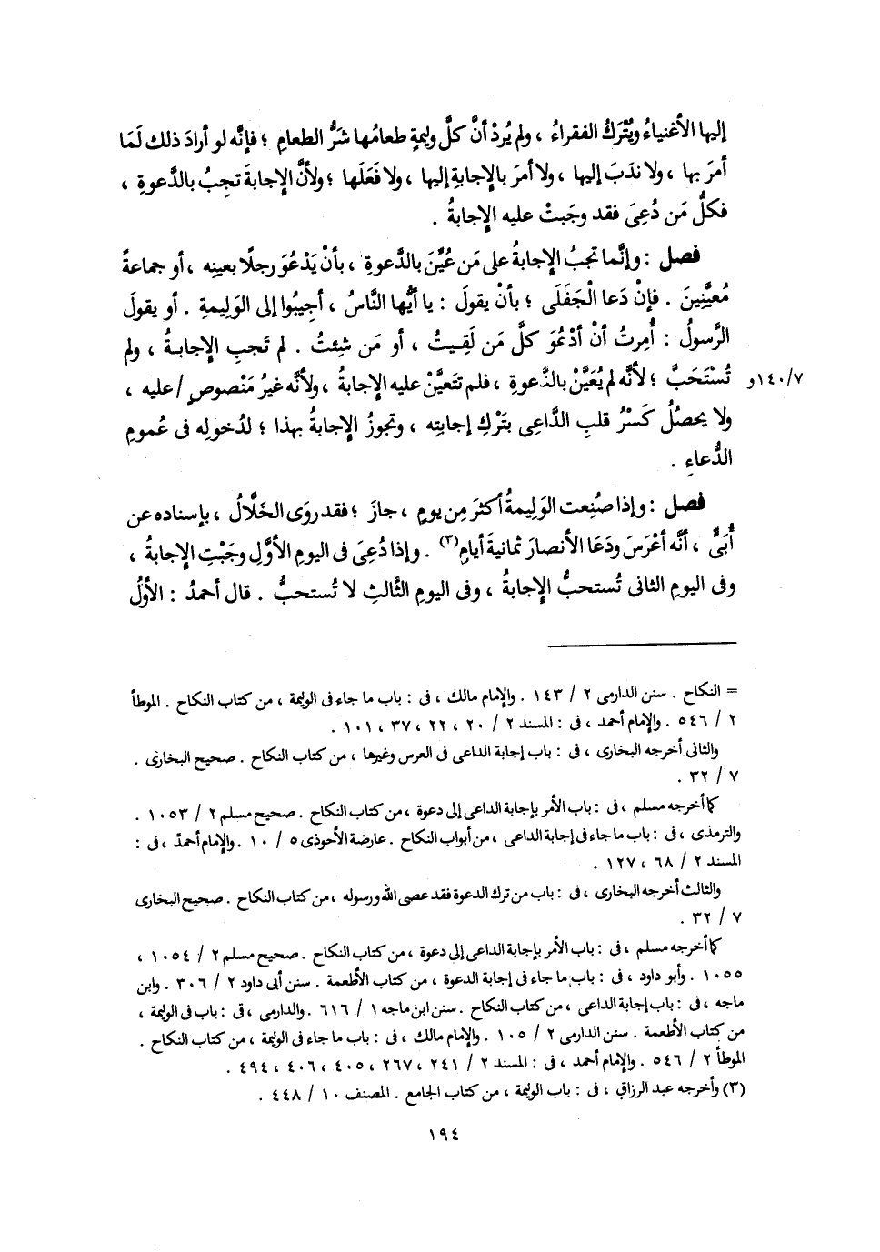 = النكاح. سنن الدارمى ٢/ ١٤٣. والإِمام مالك، فى: باب ما جاء فى الوليمة، من كتاب النكاح. الموطأ ٢/ ٥٤٦. والإِمام أحمد، فى: المسند ٢/ ٢٠، ٢٢، ٣٧، ١٠١.