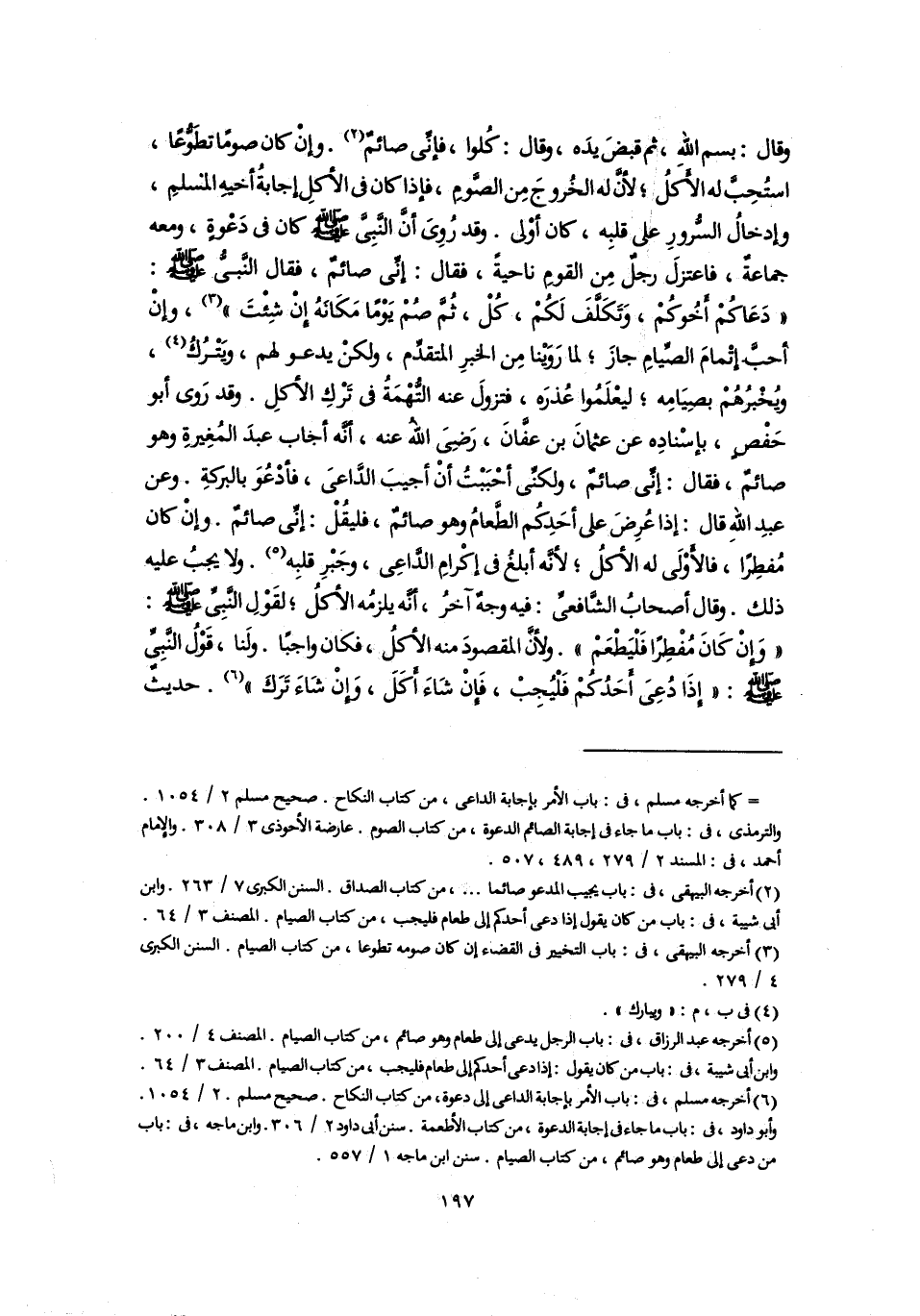 (٥) أخرجه عبد الرزاق، فى: باب الرجل يدعى إلى طعام وهو صائم، من كتاب الصيام. المصنف ٤/ ٢٠٠. وابن أبى شيبة، فى: باب من كان يقول: إذا دعى أحدكم إلى طعام فليجب، من كتاب الصيام. المصنف ٣/ ٦٤.